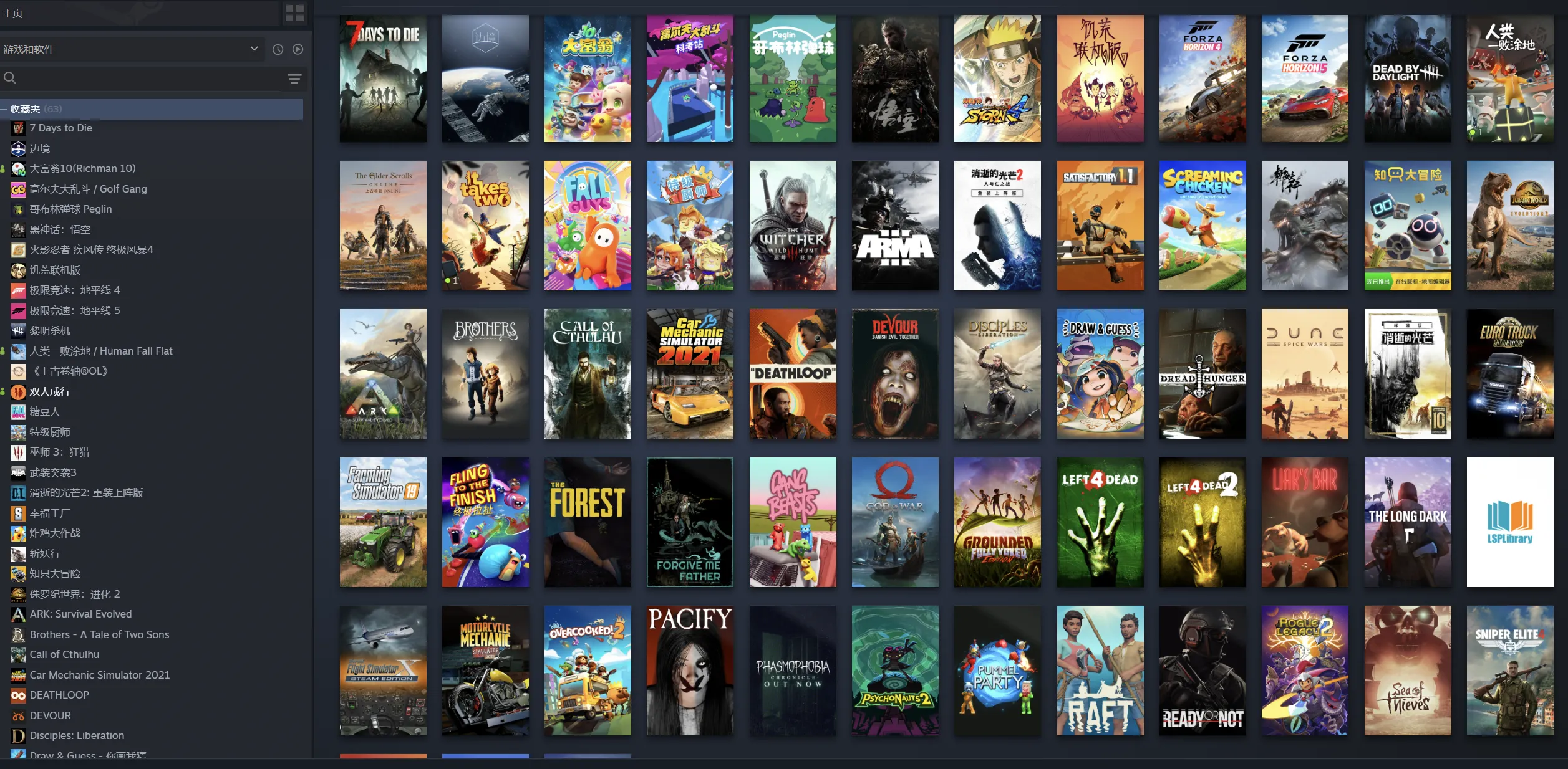 消逝的光芒困兽/消逝的光芒3、骗子酒吧、黑神话悟空、边境/记忆边境(Boundary)、恐惧饥饿、战神4(God of War)、消逝的光芒2人与仁之战预购版(Dying Light 2 Stay Human 2022.02.05上市)、死亡循环、严阵以待、绝地求生、极限竞速地平线4终极版、极限竞速地平线5、糖豆人、人类一败涂地、揍击派对、萌萌小人大乱斗、盗贼之海、大富翁10、桌游模拟、你画我猜、餐桌物语、斩妖行、禁闭求生(Grounded)、只只大冒险(Biped)、模拟大鹅(Untitled Goose Game)、胡闹厨房2/烹糊了2(Overcooked! 2)、恐鬼症/幽灵恐怖(Phasmophobia)、黎明杀机(Dead by Daylight)、终极拉扯(Fling to the Finish)、模拟农场19(Farming Simulator 19)、幸福工厂(Satisfactory)、求生之路1求生之路2(Left 4 Dead, Left 4 Dead 2)、饥荒联机版(Don't Starve Together)、方舟生存进化(ARK: Survival Evolved)、木筏求生/木筏生存(Raft)、消逝的光芒信徒增强版(Dying Light Enhanced Edition)、七日杀/7日杀(7 Days to Die)、欧洲卡车模拟2(Euro Truck Simulator 2)、吞噬(DEVOUR)、安抚(Pacify)、迷失森林(The Forest)、狙击精英4(Sniper Elite 4)、武装突袭3(Arma 3)、脑航员2(Psychonauts 2)、巫师3狂猎(The Witcher 3: Wild Hunt)、侏罗纪世界进化2(Jurassic Wor-ld Evolution 2)、微软模拟飞行10/微软模拟飞行10(Microsoft Flight Simulator X)、骑车修理工模拟器(Car Mechanic Simulator 2021)、摩托车机械师模拟器2021/摩托车修理工模拟器2021/摩托车技工模拟器2021(Motorcycle Mechanic Simulator 2021)、漫漫长夜(The Long Dark)、克苏鲁的呼唤(Call of Cthulhu®)、火影忍者 疾风传 终极风暴4/火影忍者4究极风暴(NARUTO SHIPPUDEN: Ultimate Ninja STORM 4)、沙丘香料战争(Dune: Spice Wars)、哥布林弹球 Peglin、女巫来了(Witch It)、上古卷轴OL/上古卷轴在线版(The Elder Scrolls® Online)、lsp图书馆(LSPLibrary)、盗贼遗产2(Rogue Legacy 2)、原谅我父亲(Forgive me Father)、特级厨师、高尔夫大乱斗(Golf Gang)、兄弟双子传说(Brothers - A Tale of Two Sons)、圣战群英传解放(Disciples: Liberation Standard Edition)