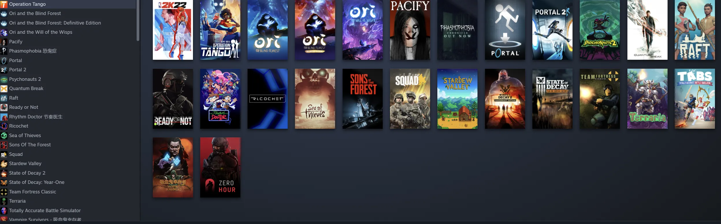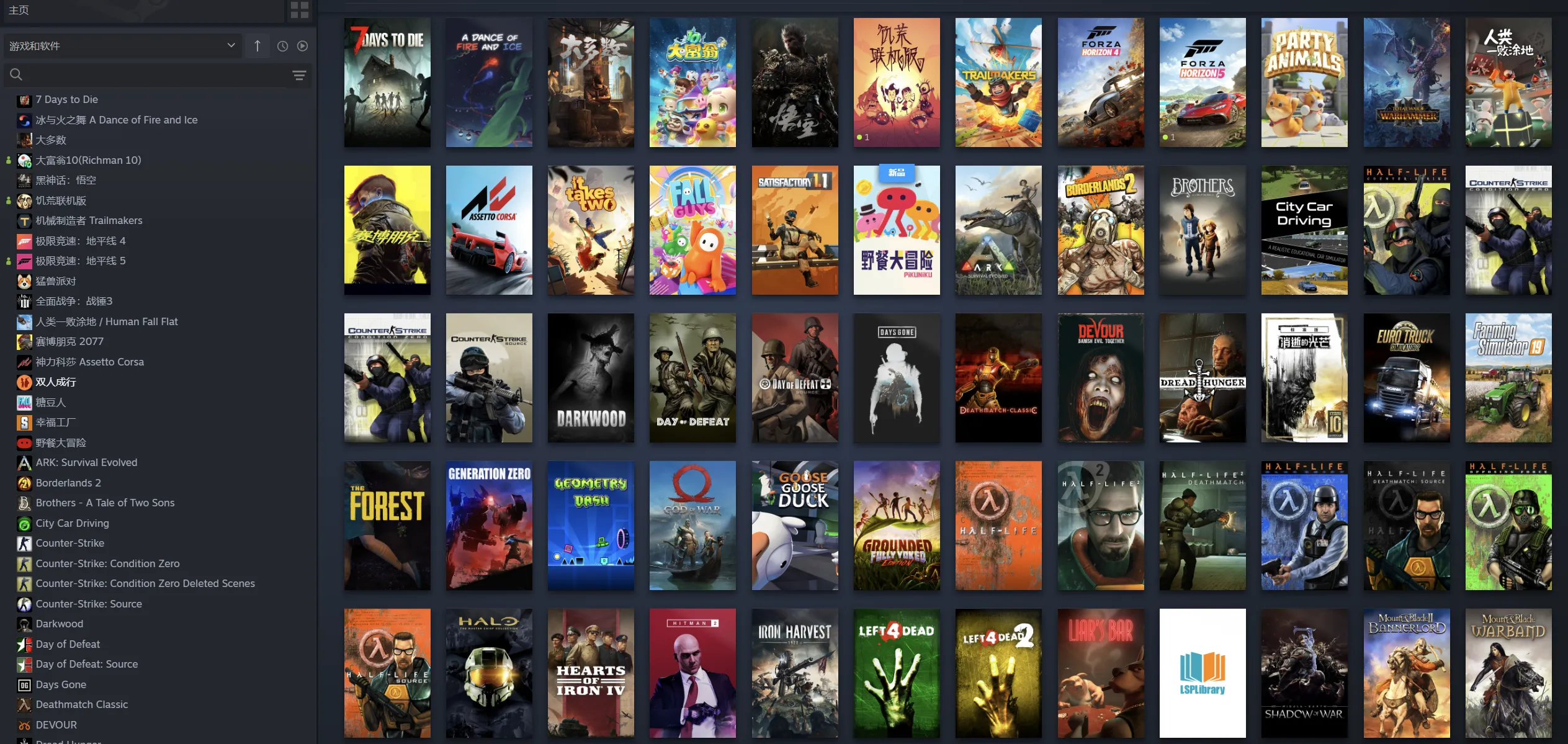 怀旧游戏(求生之路1、求生之路2、cs、反恐精英、反恐精英起源、反恐精英零点行动、胜利之日、胜利之日起源、军团要塞、半条命、半衰期蓝色行动、半衰期1起源、半衰期针锋相对、半条命2死亡竞技、半衰期2第1章、半条命2第二章、Ricochet、传送门一二)、消逝的光芒信徒增强版(Dying Light Enhanced Edition)、7日杀/七日杀(7 Days to Die)、饥荒联机版(Don't Starve Together)、泰拉瑞亚(Terraria)、幸福工厂(Satisfactory)、木筏求生/木筏生存(Raft)、欧洲卡车模拟2(Euro Truck Simulator 2)、迷失森林(The Forest)、方舟生存进化(ARK: Survival Evolved)、星露谷物语(Stardew Valley)、模拟农场19(Farming Simulator 19)、战术小队(squad)、钢铁雄心4(Hearts of Iron IV)、代号探戈/探戈行动( Operation Tango)、安抚(Pacify)、钢铁收割1920+(Iron Harvest 1920+)、赛道大师(Trailmakers)、无主之地2(Borderlands 2)、脑航员2/意航员2(Psychonauts 2)、城市骑车驾驶模拟器(City Car Driving)、量子破碎/量子裂痕(Quantum Break)、吸血鬼幸存者(Vampire Survivors)、吞噬(DEVOUR)、阴暗森林(Darkwood)、腐烂国度1+腐烂国度2(State of Decay 1 + 2)、恐鬼症/幽灵恐怖(Phasmophobia)、LSP图书馆(LSPLibrary)、恐惧饥饿/恐惧饥荒/海上狼人杀/大航海狼人杀/恐惧与饥饿(Dread Hunger)、职业足球在线(Pro Soccer Online)、全面战争模拟器(Totally Accurate Battle Simulator)、奥日与黑暗森林( Ori and the Blind Forest)、精灵与萤火意志(Ori and the Will of the Wisps)、杀手2(HITMAN 2)、神力科莎豪华版(Assetto Corsa)、零世代(Generation Zero®)、光环士长官合集(Halo: The Master Chief Collection)、兄弟双子传说(Brothers - A Tale of Two Sons)、鹅鸭杀(Goose Goose Duck)