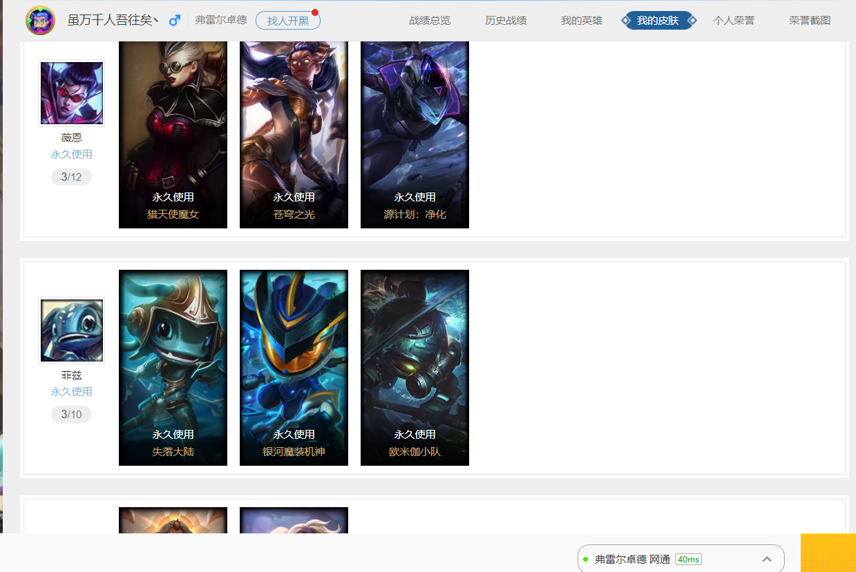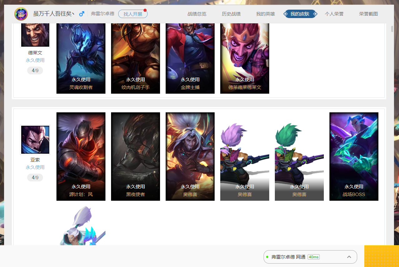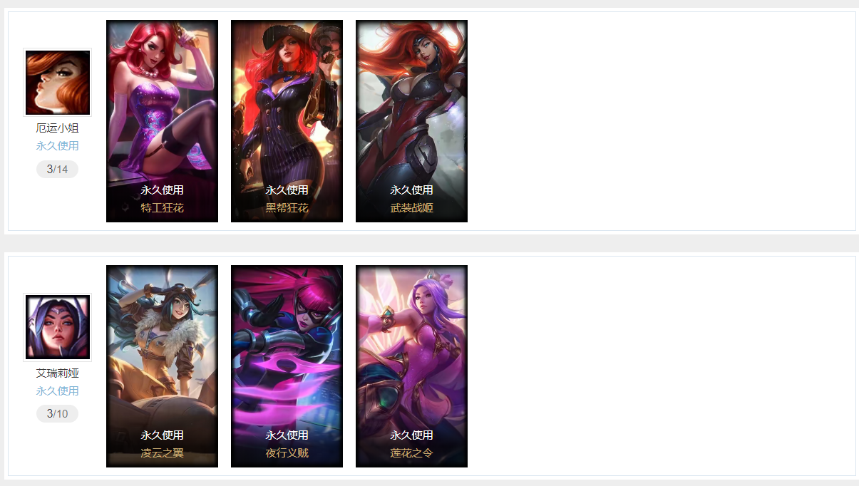 战地之王 加里奥 魔幻卡牌 崔斯特 源代码 乐芙兰 摄魂男爵 弗拉基米尔 大天使长米迦勒 凯尔 防暴天使 凯尔 星战 易 源计划:林 易 哞利斯塔 恶魔男爵 瑞兹 亮丽女神 希维尔 胜利女神 希维尔 兔宝宝 提莫 暗影 沃里克 暗影 沃里克至真至诚 特工狂花 厄运小姐 黑帮狂花 厄运小姐 武装战姬 厄运小姐 极地女神 艾希 源计划:联合 恶魔之刃 泰达米尔 复仇武神 贾克斯 贾克斯 黄金蝮蛇 黑色荆棘 莫甘娜 冲浪高手 辛吉德 假面女皇 伊芙琳 都铎王朝 图奇 黑金诱惑 图奇 法老 阿木木 殇之机器人 阿木木 熔火之心 拉莫斯 忍龟 拉莫斯 联盟之喙 艾尼维亚 黯晶凤凰 艾尼维亚 暗杀星 蒙多 自由之翼 艾瑞莉娅 夜行义贼 艾瑞莉娅 莲花之令 艾瑞莉娅 海牛骑手 库奇 白魔法师 维迦 最终BOSS 维迦 传统造型 特朗德尔 女警狙击 凯特琳 钢铁之门 布里茨 冰川巨兽 墨菲特 上古战魂 魔腾 荒野之咬 雷克顿 鳄霸 雷克顿 孤胆英豪 嘉文四世 银河魔装机神 伊莉丝 三昧真火 孙悟空 战场BOSS 布兰德 至高之拳 李青 猎天使魔女 薇恩 苍穹之光 薇恩 源计划:净化 薇恩 银河魔装机神 兰博 法国女仆 奈德丽 艳后 奈德丽 武力全开 乌迪尔 圣诞老人 古拉加斯 大夏武士 潘森 星之守护者 伊泽瑞尔 地狱送葬 约里克 铁血女忍 阿卡丽 黄金骑士 盖伦 暴君 盖伦 血色精锐 泰隆 腥红之月 泰隆 战国大名 慎 圣金巫灵 泽拉斯 黯黑魔龙 希瓦娜 星之守护者 阿狸 禁卫机甲 格雷福斯 失落大陆 菲兹 银河魔装机神 菲兹 欧米伽小队 鬼影蛙人 失落大陆 诺提勒斯 死亡骑士 瑟庄妮 奥德赛 吉格斯 灵魂收割者 德莱文 绞肉机刽子手 德莱文 金牌主播 德莱文 德莱德莱德莱文 霸天异形 卡兹克 生化骑士 德莱厄斯 源代码 丽桑卓 无限烈焰 戴安娜 鬼影森森 婕拉 银河魔装机神 纳尔 源计划:风 亚索 黑夜使者 亚索 奥德赛 亚索 奥德赛小行星带探险者 战场BOSS 亚索 源代码 卡蜜尔 腥红之月 烬 西部魔影 卢锡安 胜利之剑 亚托克斯 源代码 娜美