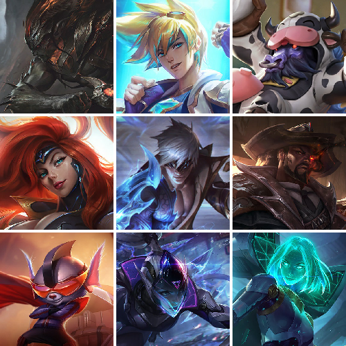 黑暗之女 狂战士 哨兵之殇 卡牌大师 德邦总管 无畏战车 诡术妖姬 猩红收割者 末日使者 审判天使 无极剑圣 牛头酋长 符文法师 亡灵战神 战争女神 众星之子 迅捷斥候 麦林炮手 祖安怒兽 雪人骑士 赏金猎人 寒冰射手 蛮族之王 武器大师 堕落天使 时光守护者 炼金术士 寡妇制造者 瘟疫之源 死亡颂唱者 虚空恐惧 殇之木乃伊 披甲龙龟 冰晶凤凰 恶魔小丑 沙漠玫瑰 琴瑟仙女 虚空行者 刀锋意志 风暴之怒 海洋之灾 英勇投弹手 天启者 瓦洛兰之盾 邪恶小法师 巨魔之王 策士统领 皮城女警 蒸汽机器人 熔岩巨兽 不祥之刃 永恒梦魇 扭曲树精 荒漠屠夫 德玛西亚皇子 蜘蛛女皇 发条魔灵 齐天大圣 复仇焰魂 盲僧 暗夜猎手 机械公敌 魔蛇之拥 水晶先锋 大发明家 沙漠死神 狂野女猎手 兽灵行者 钢铁大使圣锤之毅 酒桶 战争之王 探险家 金属大师铁铠冥魂 摆渡者( 牧魂人) 暗影之拳 狂暴之心 德玛西亚之力 曙光女神 虚空先知 刀锋之影 放逐之刃 深渊巨口 暮光之眼 光辉女郎 远古巫灵 龙血武姬 九尾妖狐 法外狂徒 潮汐海灵 不灭狂雷 傲之追猎者 惩戒之箭 深海泰坦 机械先驱 凛冬之怒 无双剑姬 爆破鬼才 仙灵女巫 荣耀行刑官 战争之影 虚空掠夺者 诺克萨斯之手 未来守护者 冰霜女巫 皎月女神 德玛西亚之翼 暗黑元首 影流之镰 暮光星灵 荆棘之兴 虚空之女 星籁歌姬 迷失之牙 生化魔人 疾风剑豪 虚空之眼 岩雀 青钢影 弗雷尔卓德之心 戏命师 永猎双子 暴走萝莉 河流之王 破败之王 涤魂圣枪 圣枪游侠 影流之主 暴怒骑士 时间刺客 元素女皇 皮城执法官 暗裔剑魔 唤潮鲛姬 沙漠皇帝 魔法猫咪 祖安狂人 魂锁典狱长 海兽祭司 虚空遁地兽 复仇之矛 星界游神 幻翎 逆羽 山隐之焰 解脱者 万花通灵 残月之啸 熔铁少女 血港鬼影 封魔剑魂 腕豪 含羞蓓蕾