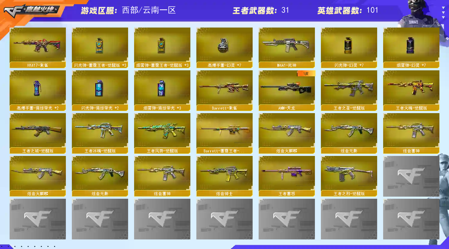 王者/炫金武器:觉醒炼狱、王者白虎、王者蔷薇、王者之烈、王者冰魄、王者火魄、王者之圣、王者之城、王者幻神、王者雷怒、王者之决、炫金雷神、炫金火麒麟、炫金无影、炫金黑骑士。