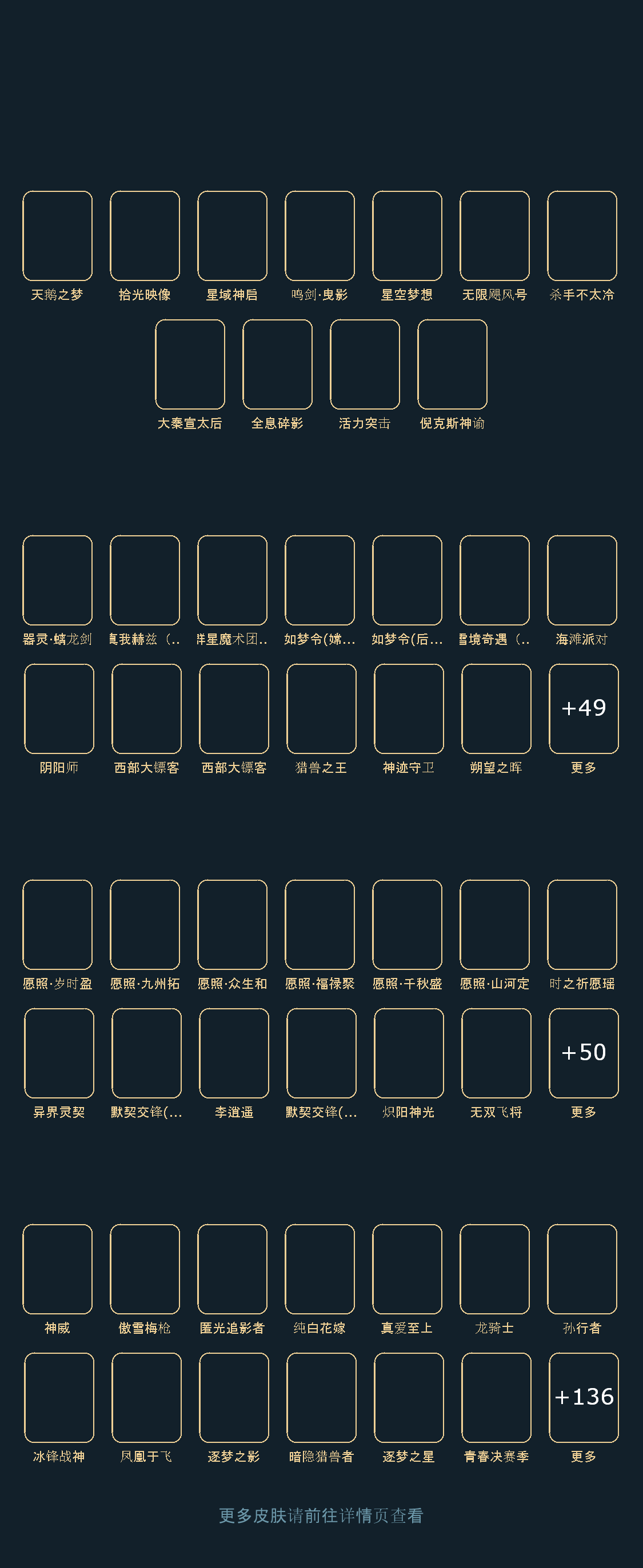 冰锋战神/街头霸王/天鹅之梦/纯白花嫁/杀手不太冷/真爱至上/王者之锤/大秦宣太后/凤求凰/逐梦之影/星空梦想/无限飓风号/黄金狮子座/一生所爱/全息碎影/青龙志/活力突击/太华/久胜战神/梁祝/倪克斯神谕/白鹤梁神女/匿光追影者/鸣剑·曳影/遇见胡旋/星域神启/李逍遥/武圣/奔雷神使/孙行者/玉兔公主/补天/异界灵契/神威/傲雪梅枪/淬星耀世/时雨天司