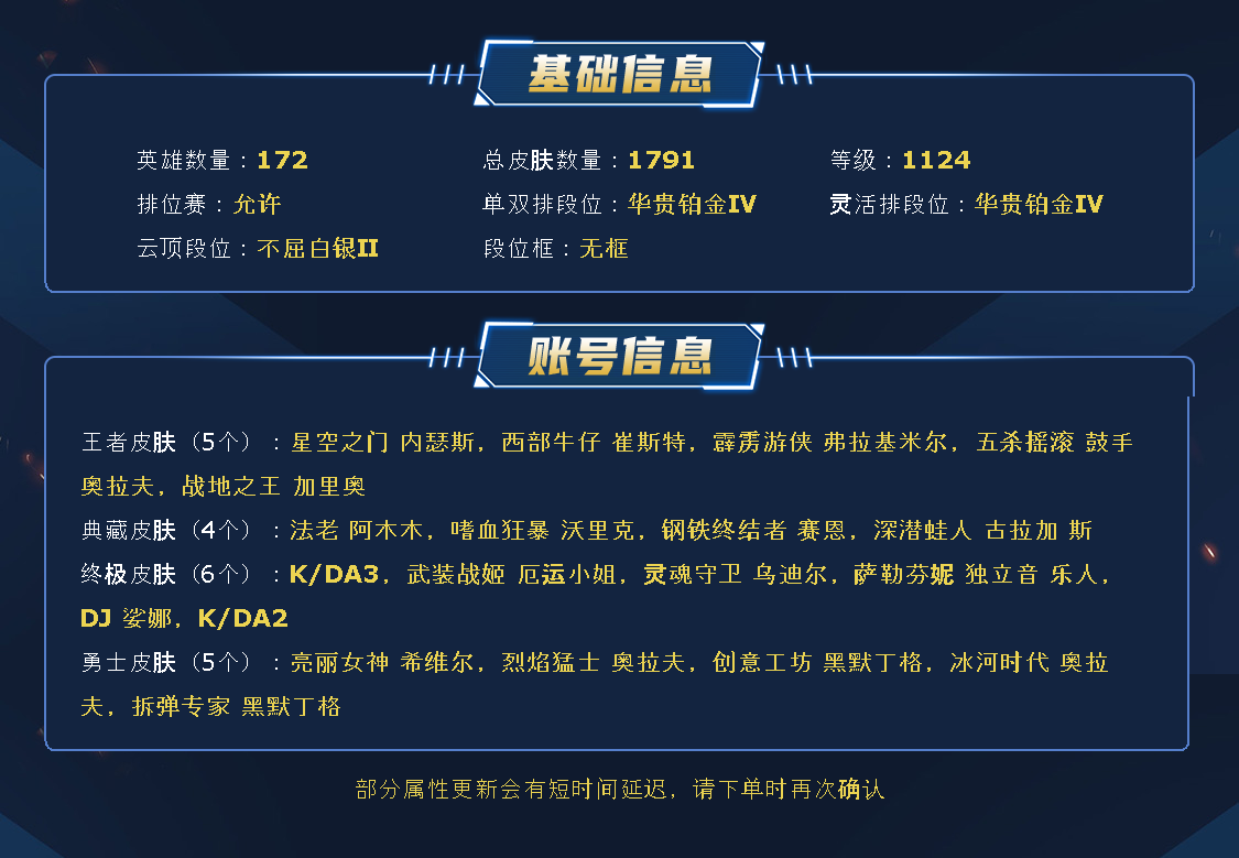 ~~喜欢记得收藏~~可排位~~1724皮全英雄丨60神话/至臻/海克斯丨IG套丨神龙尊者套丨灵魂莲华套丨FPX套丨KDA套丨甜心霞洛丨玉剑女刀丨破败锤石丨甜心格温丨泳池佐伊丨哨兵薇恩丨女帝风女丨福牛厄斐琉斯丨电玩女警卡莎丨觅心悠米金克斯丨星守佐伊狐狸风女ez~~租之前尽量查一下游戏ID,确保段位是您需要的,避免浪费您的时间~~请勿挂机逃跑故意送人头,谢谢合作,谢谢~~