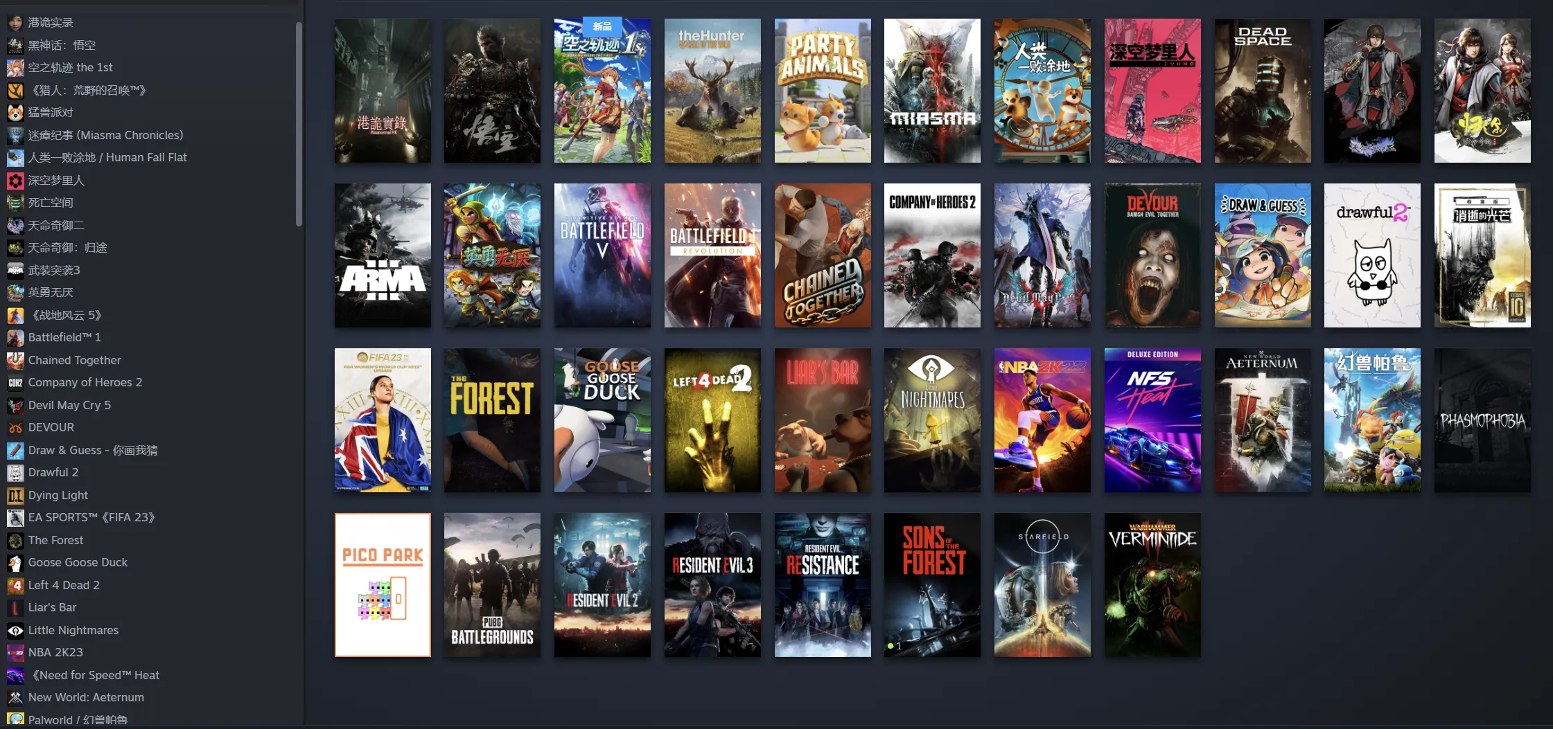 PEAK(拉我一把)、我们到了吗?/房车还在那里/房车有吗(RV There Yet?)、空之轨迹 the 1st、骗子酒吧、黑神话悟空预购版(2024.08.20才能玩)、链在一起(Chained Together)、幻兽帕鲁(Palworld)、动物派对/猛兽派对预购版、星空预购版(Starfield,)、森林之子(Sons Of The Forest)、死亡空间重置版2023(Dead Space 2023)、天命奇御二、 天命奇御归途/天命奇御歸途、EA SPORTS™《FIFA 23》/fifa23、NBA 2K23/NBA2k23、消逝的光芒豪华版(信徒+体育场+碰撞测试包+终极生存包+季票)、幽灵恐怖-恐惧症-恐鬼症(Phasmophobia)、武装突袭三/武装突袭3、鬼泣5、生化危机2重置版、生化危机3重置版、小小梦魇1、吞噬 Devour、求生之路2、英雄连2、迷失森林、佳慧、战锤2末世鼠疫/战锤末世鼠疫2、你画我猜、饼干点点乐、绝地求生大逃杀 (PLAYERUNKNOWN'S BATTLEGROUNDS)、极品飞车21热力豪华版(Need for Speed™ Heat Deluxe Edition)、求生之路2、战地风云1/战地1( Battlefield™ 1 Revolution)、战地5/战地风云5(Battlefield™ V Definitive Edition)、鹅鸭杀、猎人荒野的呼唤、人类一败涂地、Drawful 2、英勇无厌、迷瘴纪事(Miasma Chronicles)、Citizen Sleeper(深夜梦中人)