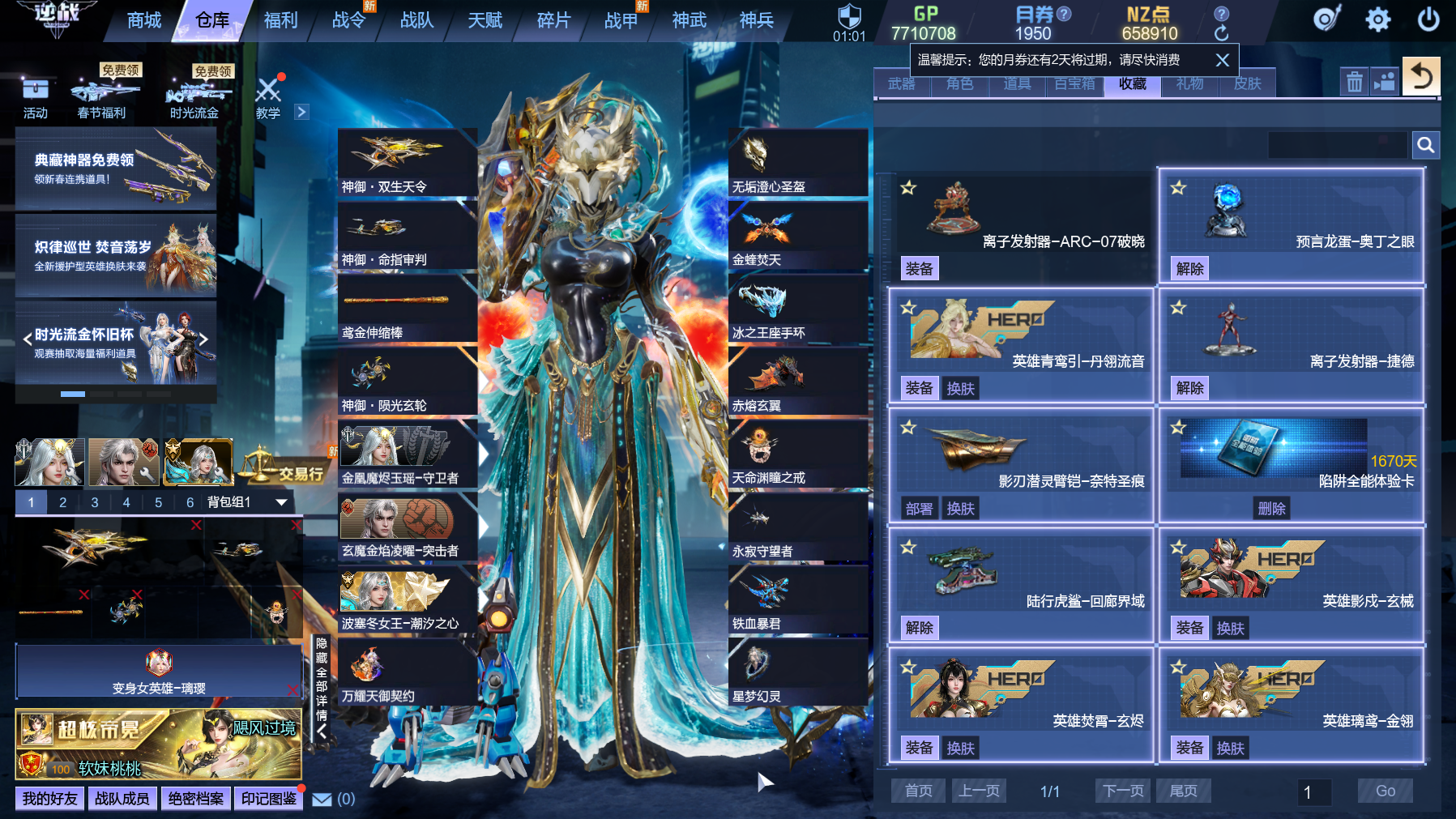 深渊武器30级、神武宝库绀蓝套、奥特曼五件套、塔防陷阱全能卡有很多天、百宝箱三级、泽塔装甲、裁决女帝-龙姬、