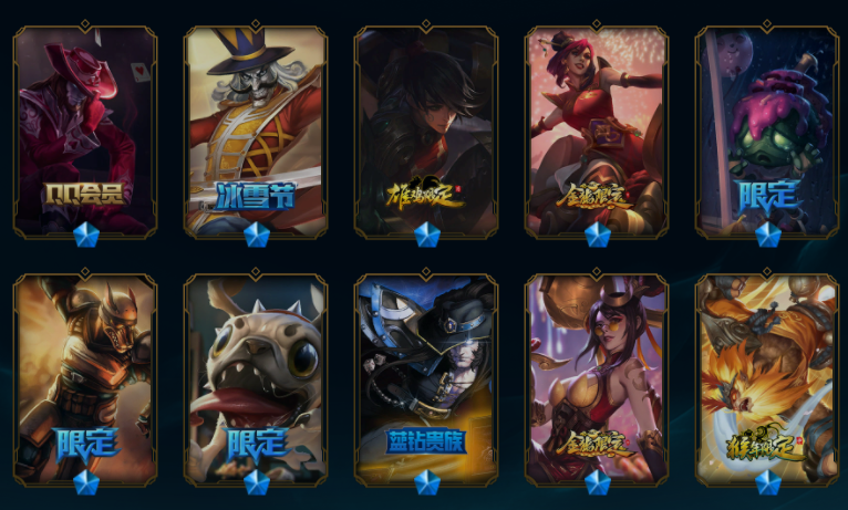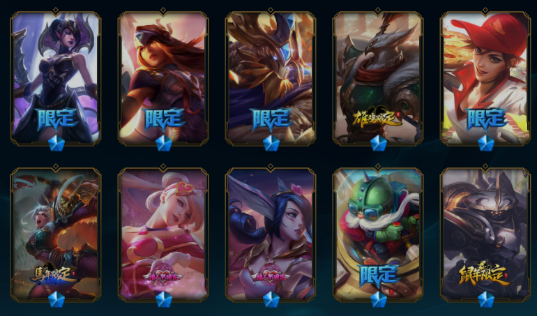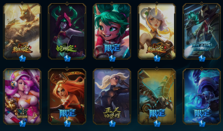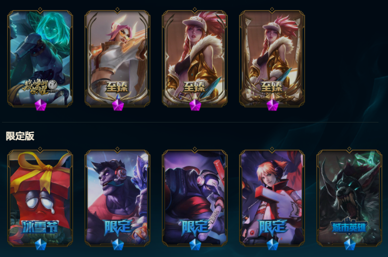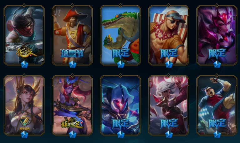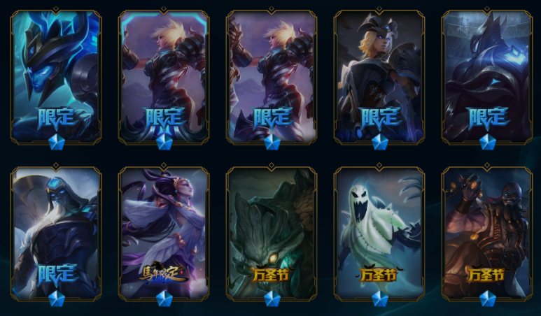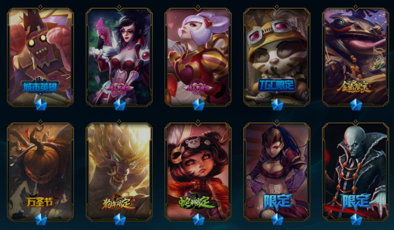 【549原皮肤】王国机神青龙德莱文、王国机神玄武盖伦、玉剑传说舞剑仙刀妹、斩星魔剑易、征服者卡尔玛、广寒仙子皎月、摄魂薇恩、鼠年贾克斯、鼠年德莱文、鼠年盖伦、周年刀妹、纳财大帝塔姆、烈焰美人VN、金猪烈焰猪妹、司马懿仲达、马年皎月、狗年狗头、狗年狼人、狗年光辉、蛇年蛇女、蛇年飞机、蛇年安妮、电玩女枪、虎痴之拳、猴年猴子、猴年女警、羊年金克丝、花木兰、龙刀、黑夜/黎明使者奶妈、灵魂守卫、地底世界、冠军之血、冠军之隐、冠军之志、克格汪、送披萨的小姐姐、觅心魔灵发条、甜心宝贝琴女、甜心之羽霞、胜利女神莫甘娜、胜利女神希维尔、万圣节人马、舞会公主、勇者阿狸、制胜金靴、黎明锐雯、日蚀骑士日女、神拳、天煞劫、西部魔影卢锡安、星守金克丝、源计划VN、源计划寒冰、奥德赛琴女、奥德赛亚索、弹幕天使卡莎、地狱火阿木木、地狱火卡尔萨斯、地狱火韦鲁斯、电玩女警、古神梦魇、禁卫机甲男枪、黎明使者豹女、吕布、奈落之炎慎、千纸双子、糖果大战布隆、糖果大战寡妇、天蝎星神斯卡纳、未来战士锐雯、腥红之月剑魔希维尔、永恒之森阿狸小法、源计划狼人、战斗学院拉克丝、赵云、真实伤害奇亚娜、K/DA寡妇