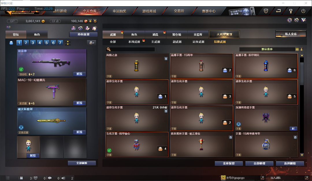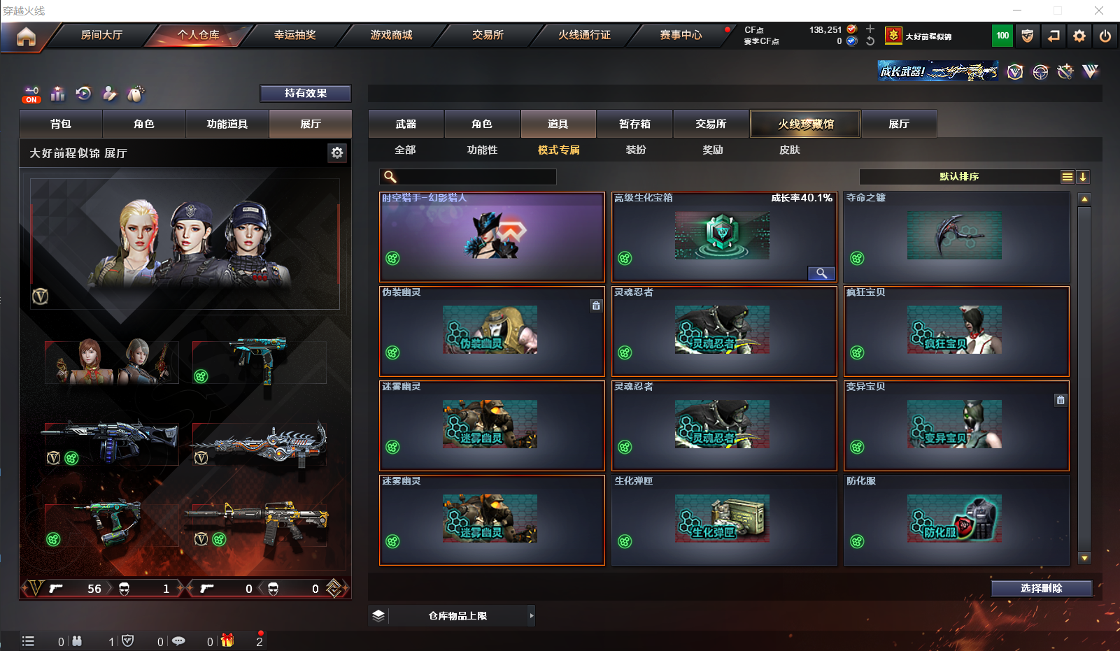 道具:伪装幽灵 变异宝贝 灵魂忍者 防护服 生化弹夹 机枪弹夹 冲峰枪弹夹 超级对讲机 猫耳头盔 超级护目镜 夺命之镰 防弹衣 防弹帽