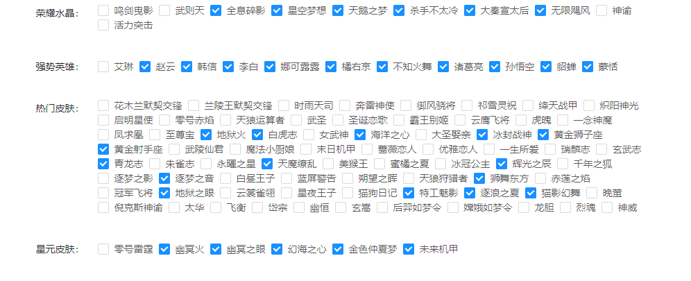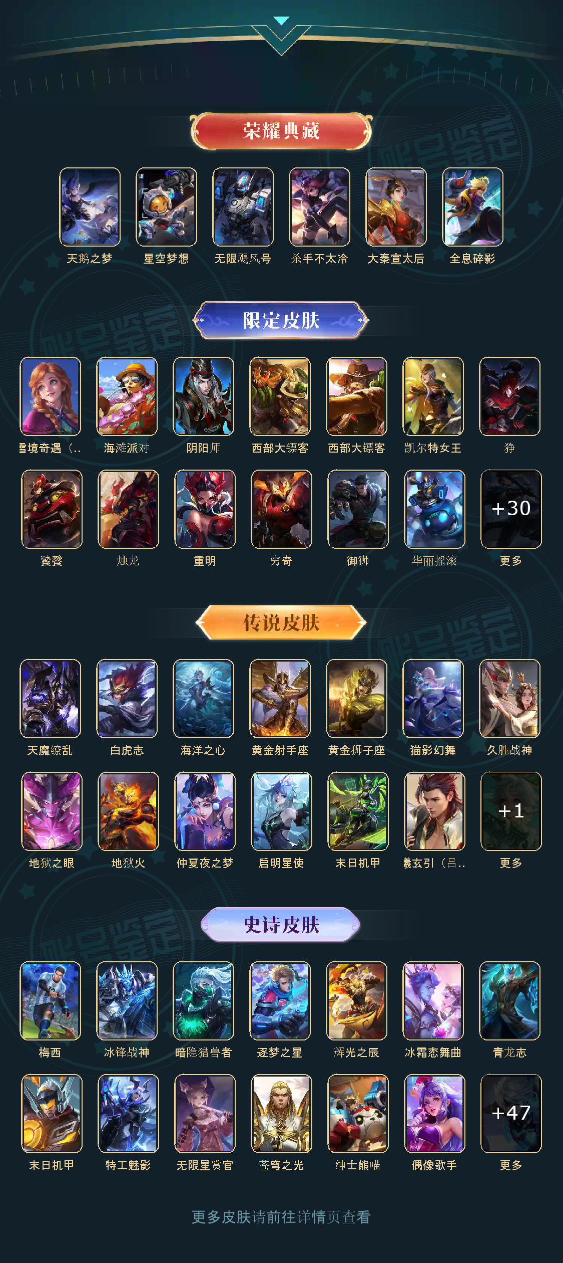 英雄数量100,典藏皮肤数6,皮肤数量190,