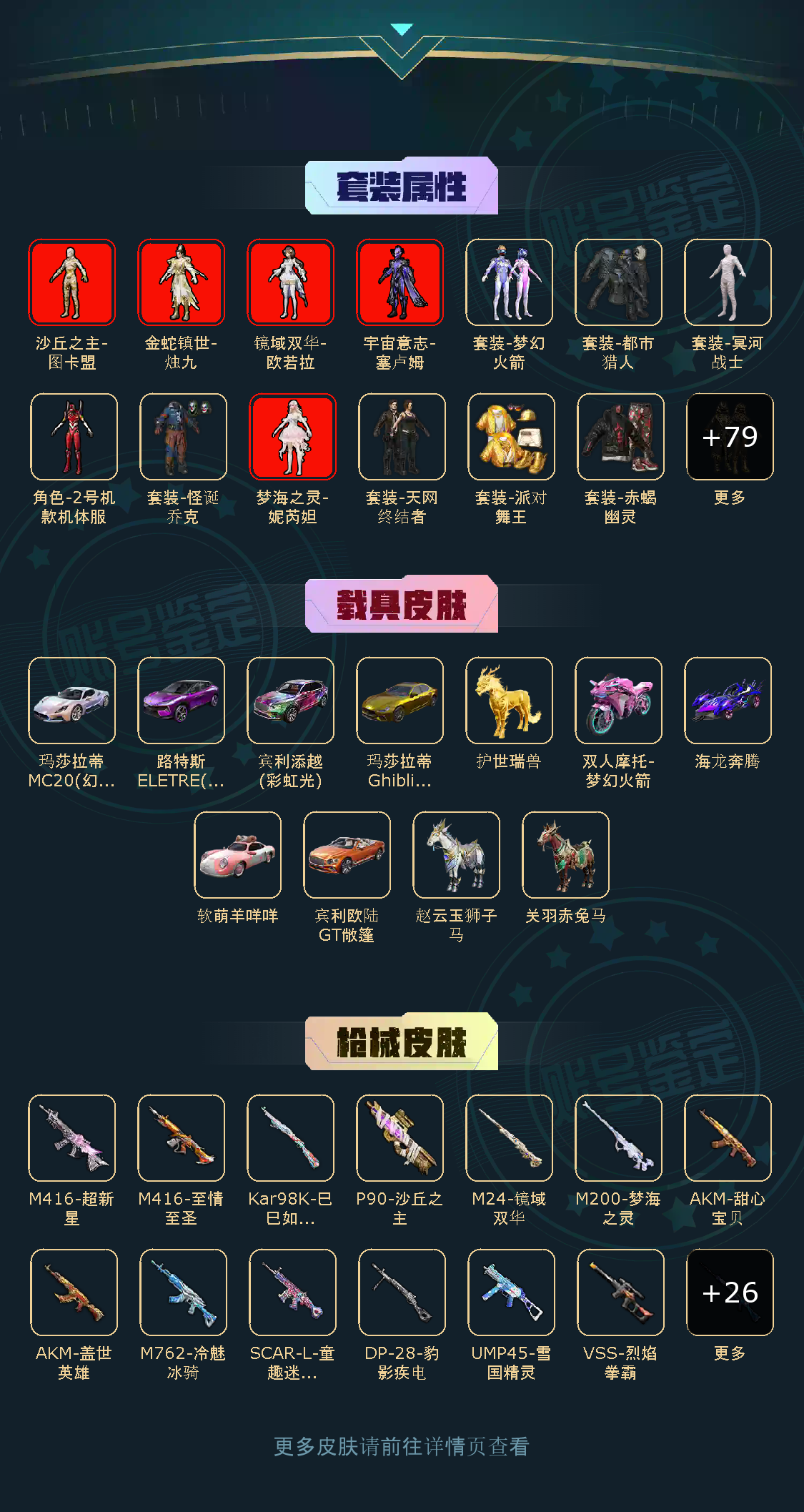 354套装,DP-28-暗夜鎏金/AKM-盖世英雄/AKM-甜心宝贝/SCAR-L-童趣迷兔/SKS-碧影闪光/AUG-星之彼岸/M249-彩虹甜喵/AWM-花间之火/M762-甜心娃娃/MG3-炙焰牛王/GROZA-香水柠檬/AWM-橘柚倾心/M416-心之恋语/平底锅-林间仙鹿/M416-五爪金龙/M16A4-垂柳戏鸭/AKM-炫紫旋律/MG3-洛神天依/GROZA-焦糖拿铁/M762-冷魅冰骑/UZI-筑梦精灵/M416-至情至圣/SLR-暗夜玫瑰/S12K-海渊国主/VSS-烈焰拳霸/AUG-妙趣可丽/UMP45-雪国精灵/M762-甜蜜誓约/MK20-H-海螺星光/UMP45-恐龙拽拽/AKM-梦之光华/路特斯EVIJA(星际黄)/玛莎拉蒂Ghibli(金)/海龙奔腾/双人摩托-梦幻火箭/玛莎拉蒂MC20(幻星粉)/快艇-塞莎KL27(霓虹粉)/路特斯ELETRE(电光紫)/极速兔兔/软萌羊咩咩/