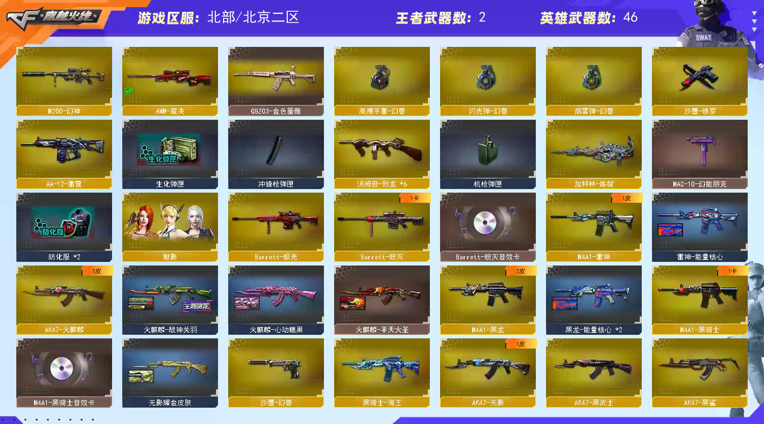 【主 武】:M200幻神、6烈龙死亡之眼、王者之翼、王者之魄、炫金雷神、炫金毁灭X2、火麒麟X2、黑龙、雷神、无影、黑骑士、黑武士X2、超新星、黑鲨、龙血X2、无影神兵利器、QBZ金色蔷薇、猎神、烈火X2、黑骑士海王、天龙、毁灭、极光、裁决、金色蔷薇巴雷特X2、加特林炼狱、AA12雷霆、毁灭征服者、冰龙粉碎者、机甲撕裂者、激光毁灭者、圣炎切割者、深渊巨龙咆哮、神圣爆裂者、试炼破坏者、苍雷、金魔等各种活动武器