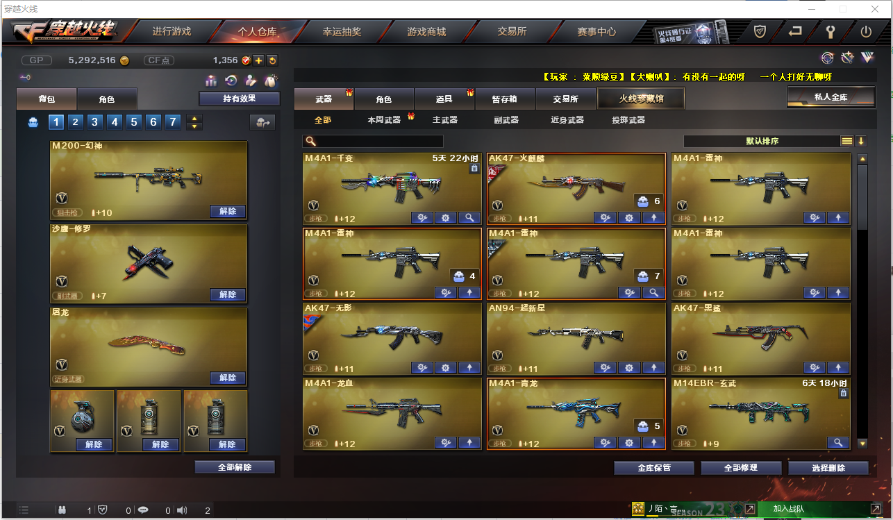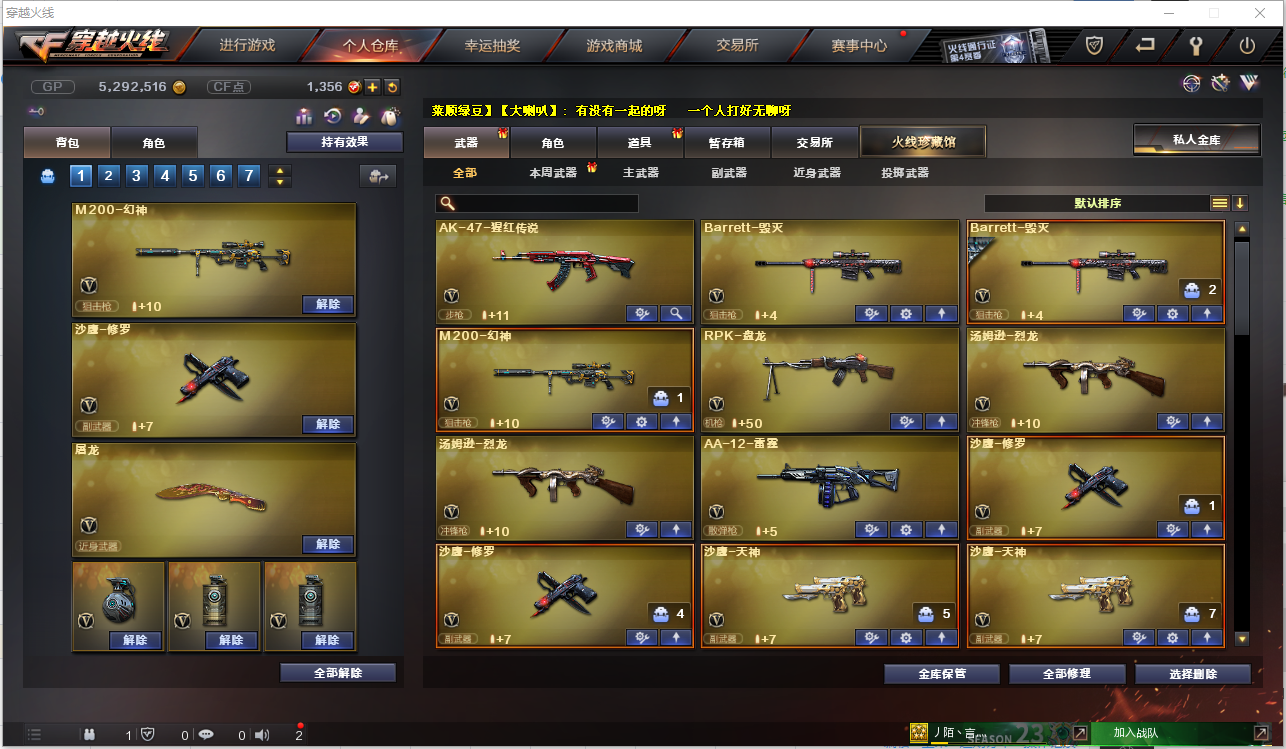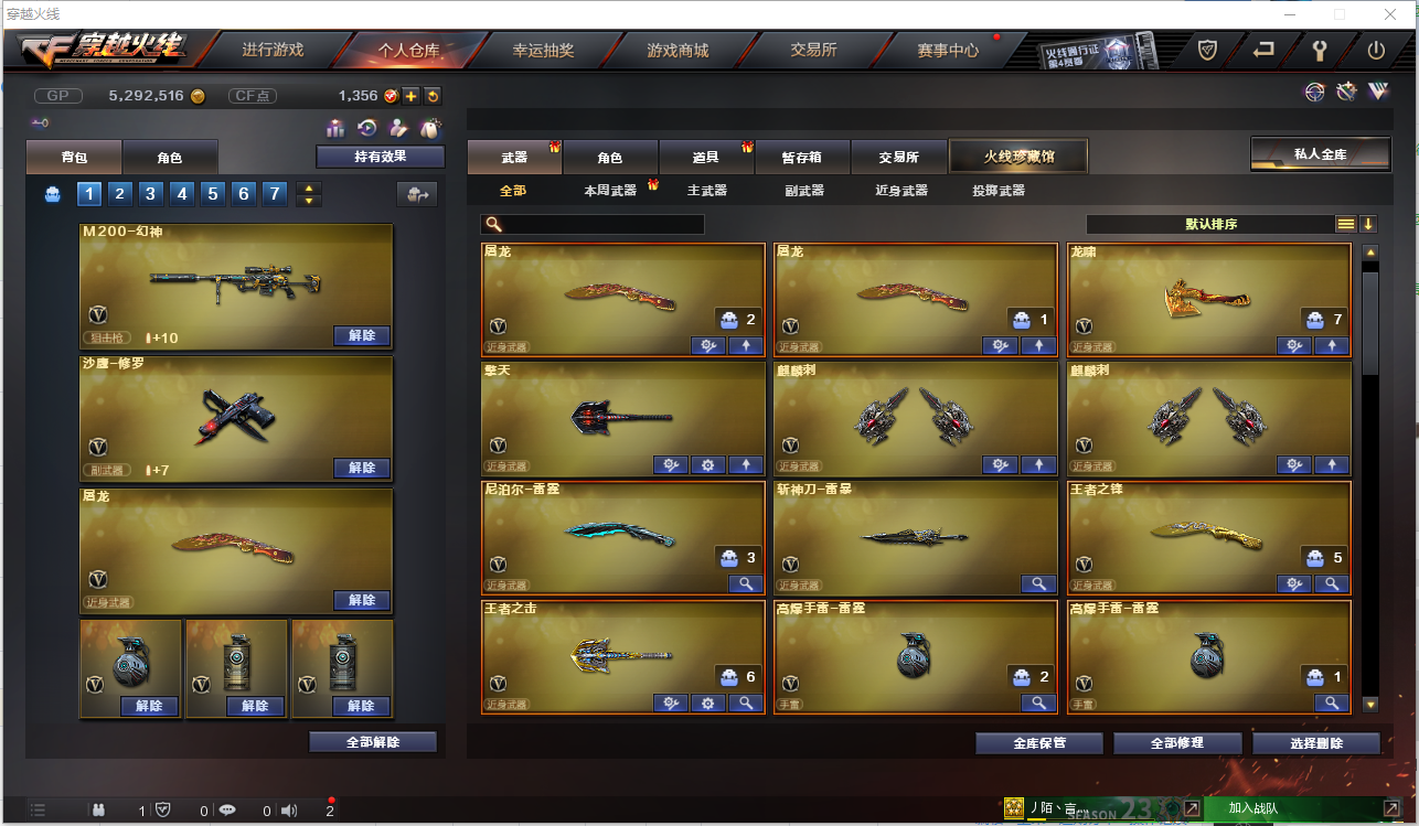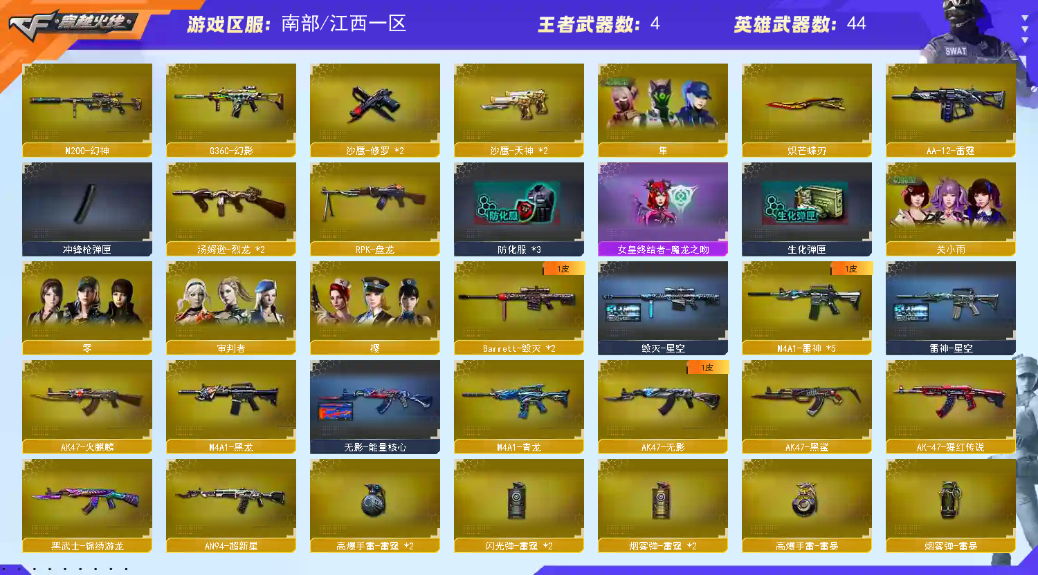 【主 武】:M200幻神、王者之幻、G36C幻影、炫金武士、炫金雷神、炫金毁灭、火麒麟(AG战队)、雷神、无影、超新星、黑鲨、龙血、青龙、猩红传说、毁灭、盘龙、烈龙X2、AA12雷霆、金魔等各种活动武器