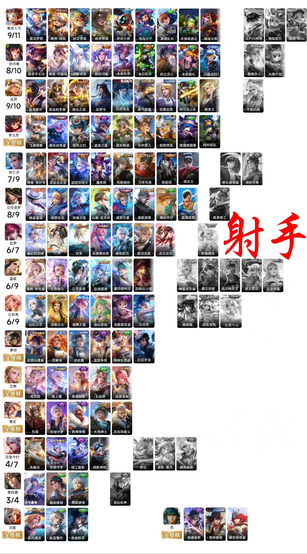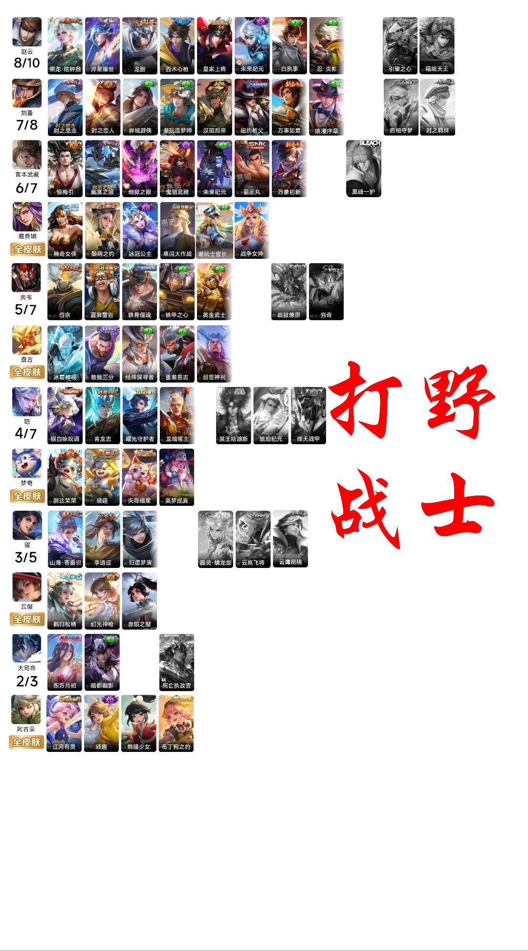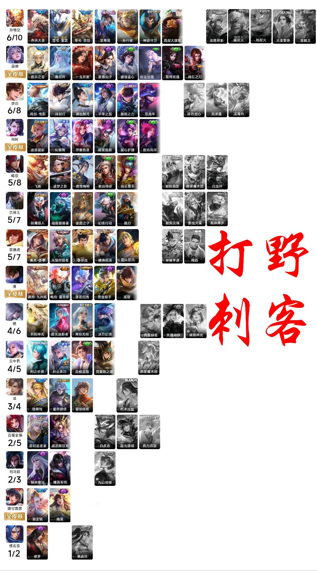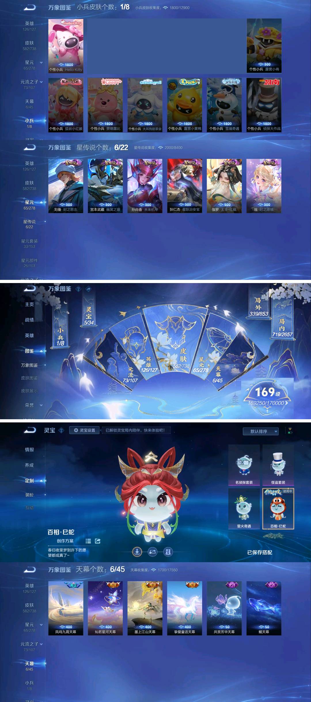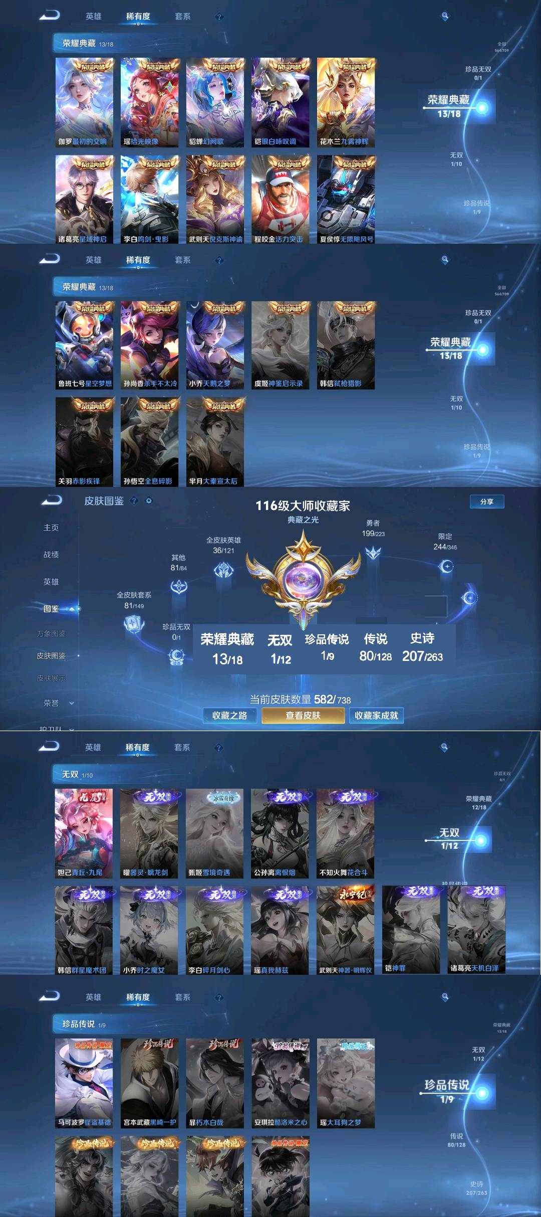 贵族等级V10,英雄数量123,典藏皮肤数11,皮肤数量544,纯白花嫁/天魔缭乱/至尊宝/真爱至上/热情桑巴/青龙志/朱雀志/久胜战神/飞衡/倪克斯神谕/匿光追影者/鸣剑·曳影/乘龙·问璇玑/心动手记(朵莉亚)/时之奇旅(鲁班七号)/无双飞将/至美·化雀舞/时之祈愿瑶/遇见神鼓/星域神启/李逍遥/逐花归海/武圣/幻阙歌/至美·乘鲤谣/琥珀纪元(伽罗)/霜月吟/乘龙·淬吴钩/乘龙·铭钟鼎/妄想实况/深海之息/玉兔公主/补天/乘龙·聚宝船/惊梅引/异界灵契/神威/炽阳神光/启示之音/乘龙·忆丹青/心动手记(海诺)/青丘·九尾/鹤归松栖(云缨)/银白咏叹调/傲雪梅枪/纯白花嫁/天魔缭乱/至尊宝/真爱至上/热情桑巴/青龙志/朱雀志/久胜战神/飞衡/倪克斯神谕/匿光追影者/鸣剑·曳影/乘龙·问璇玑/心动手记(朵莉亚)/时之奇旅(鲁班七号)/无双飞将/至美·化雀舞/时之祈愿瑶/遇见神鼓/星域神启/李逍遥/逐花归海/武圣/幻阙歌/至美·乘鲤谣/琥珀纪元(伽罗)/霜月吟/乘龙·淬吴钩/乘龙·铭钟鼎/妄想实况/深海之息/玉兔公主/补天/乘龙·聚宝船/惊梅引/异界灵契/神威/炽阳神光/启示之音/乘龙·忆丹青/心动手记(海诺)/青丘·九尾/鹤归松栖(云缨)/银白咏叹调/傲雪梅枪