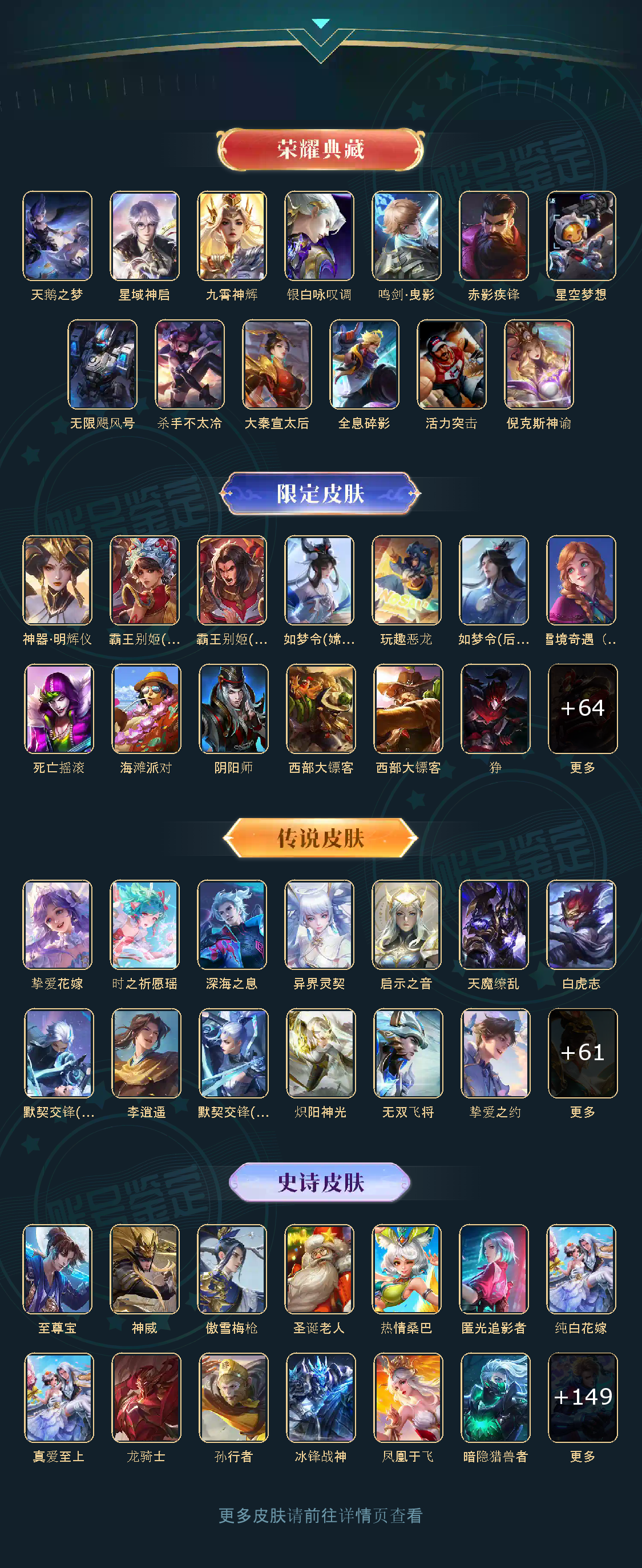 贵族等级V10,典藏皮肤数13,纯白花嫁/天魔缭乱/至尊宝/真爱至上/圣诞老人/热情桑巴/梅西/青龙志/白虎志/朱雀志/久胜战神/飞衡/倪克斯神谕/匿光追影者/鸣剑·曳影/星域神启/李逍遥/武圣/玉兔公主/补天/异界灵契/神威/启示之音/傲雪梅枪/时雨天司