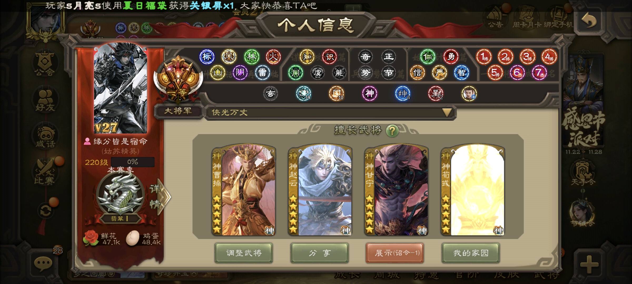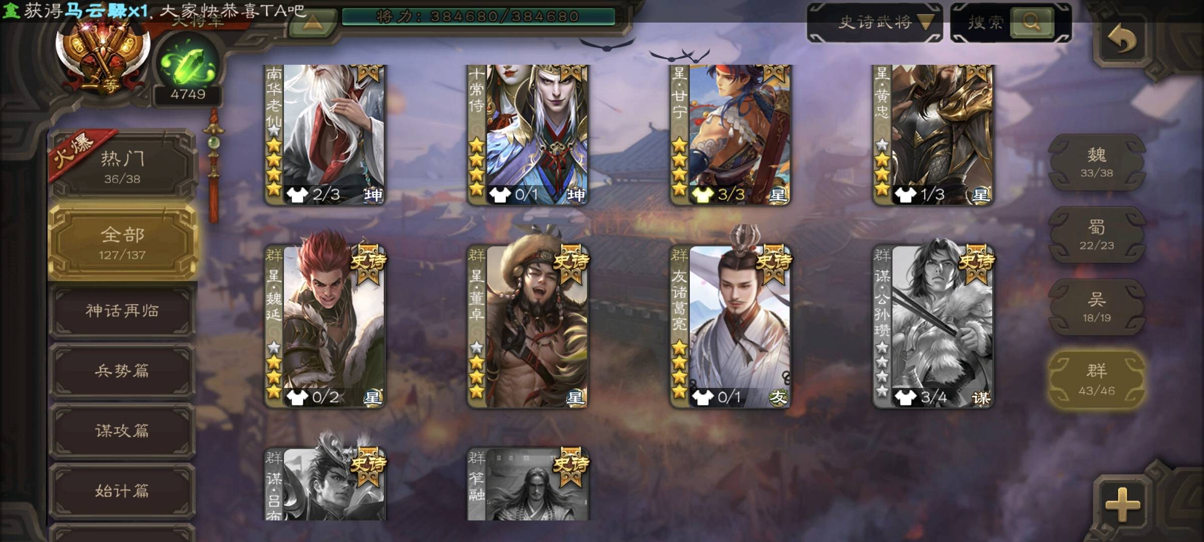 群——左慈,许攸,谋貂蝉,杜预,刘璋,界左慈,沮授,界李儒,张让,麹义,陶谦,士燮,司马徽,卑弥呼,刘焉,王允,苏飞,公孙康,兀突骨,祢衡,庞德公,郑玄,星甘宁,张仲景,黄甫嵩,界沮授,审配,徐荣,陈登,张琪瑛,灵雎,杨彪,裴秀,十常侍,星黄忠,星魏延,sp甄姬,谋张角,友诸葛亮,势于吉