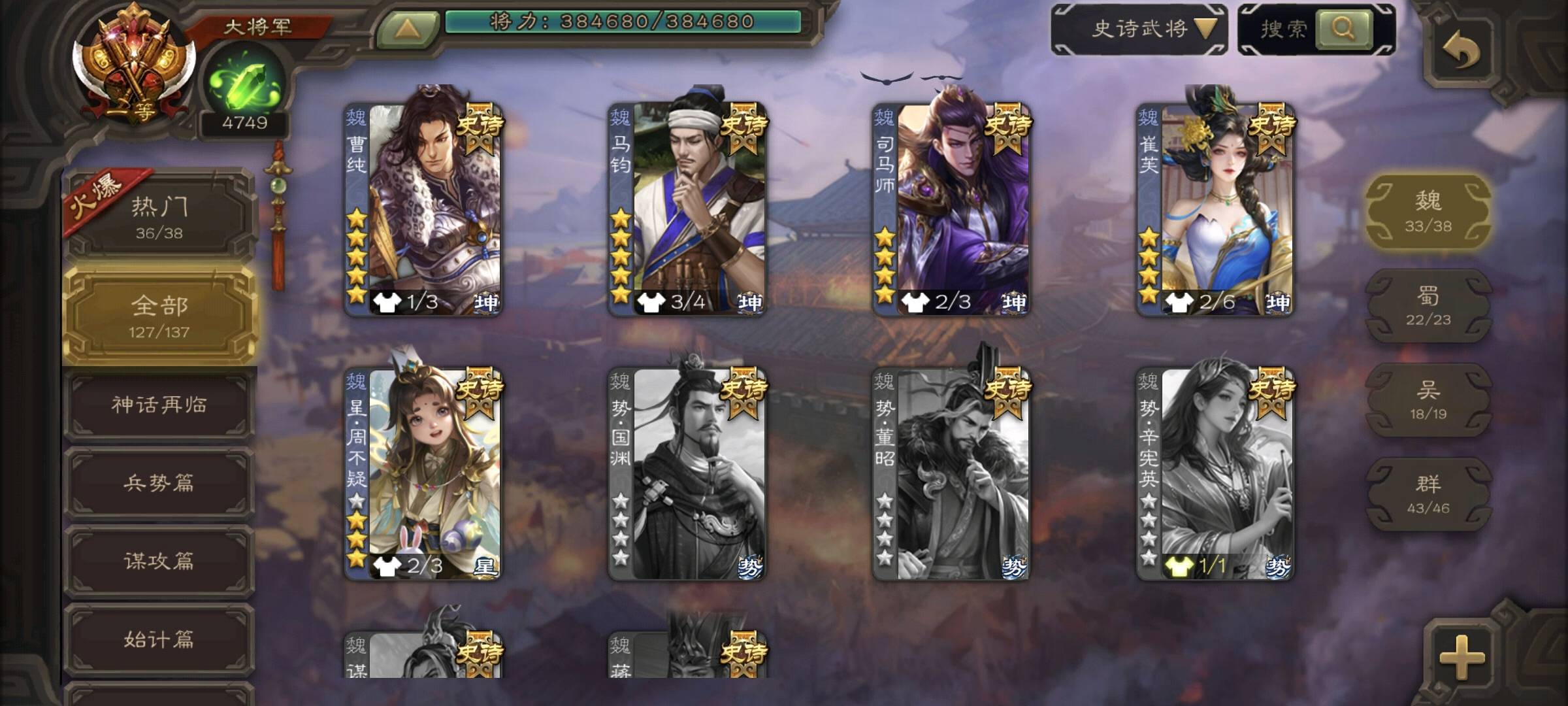 魏——郝昭,谋曹操,谋曹仁,王粲,王凌,文鸯,张昌蒲,界于禁,界钟会,界曹真,熙康,程昱,戏志才,杨修,陈琳,王朗,刘哔,王元姬,羊徽瑜,司马昭,曹纯,马钧,司马师,曹婴,郭女王,星周不疑,谋曹丕,蒋干,谋夏侯惇,曹髦