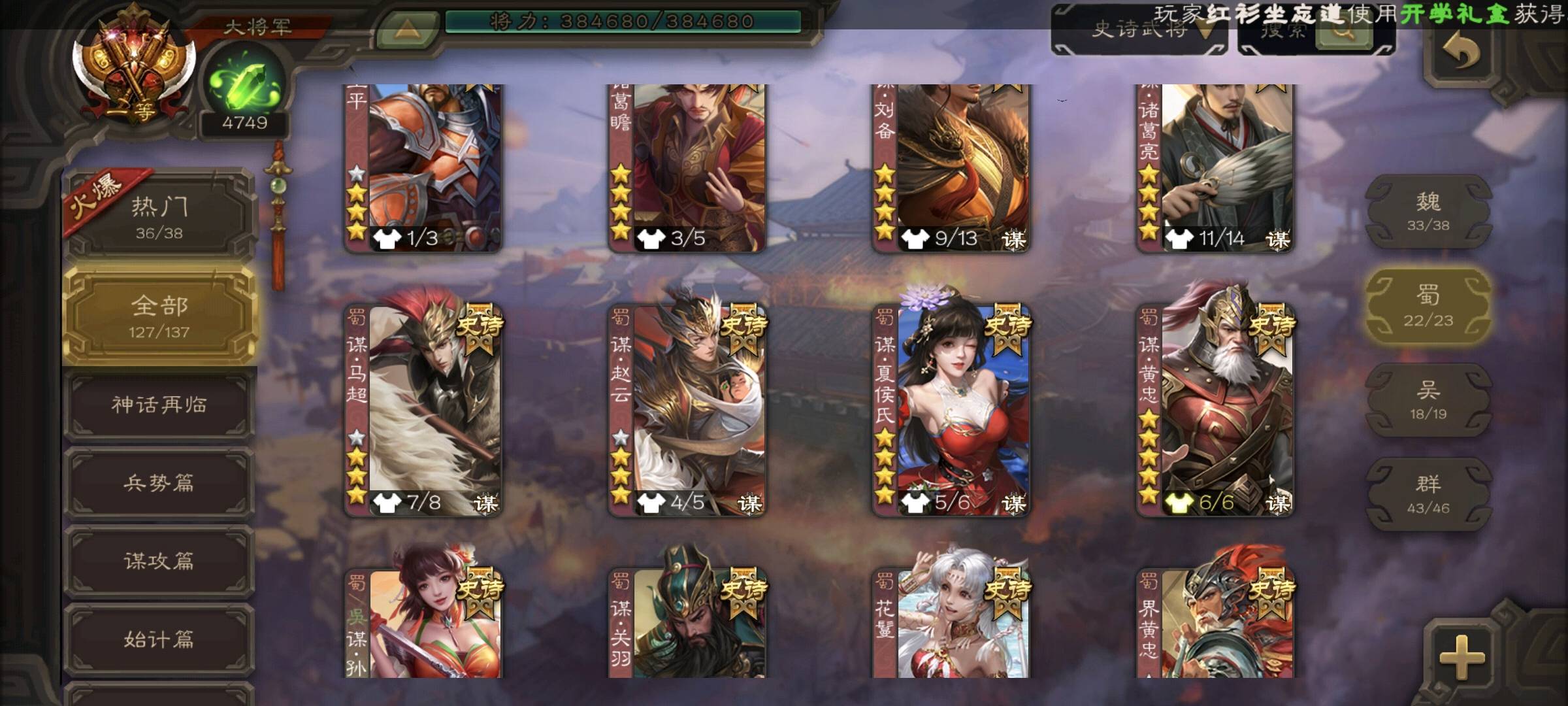 蜀——王平,诸葛瞻,谋马超,谋赵云,谋夏侯氏,花鬘,界黄忠,马云騄,张星彩,董允,赵襄,关索,沙摩柯,周群,谯周,谋刘备,某黄忠,谋孙尚香,鲍三娘,傅佥,谋诸葛亮,谋关羽