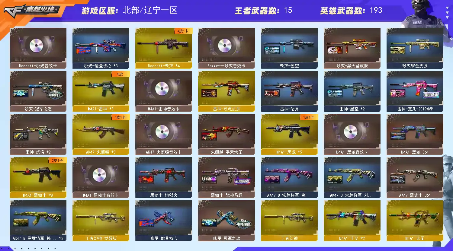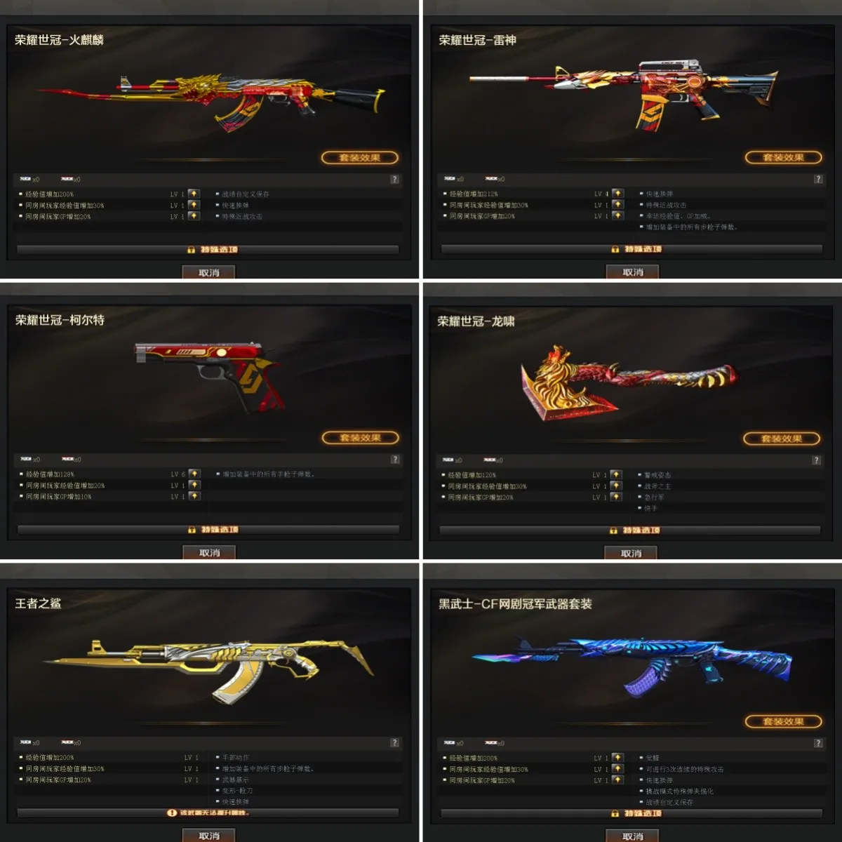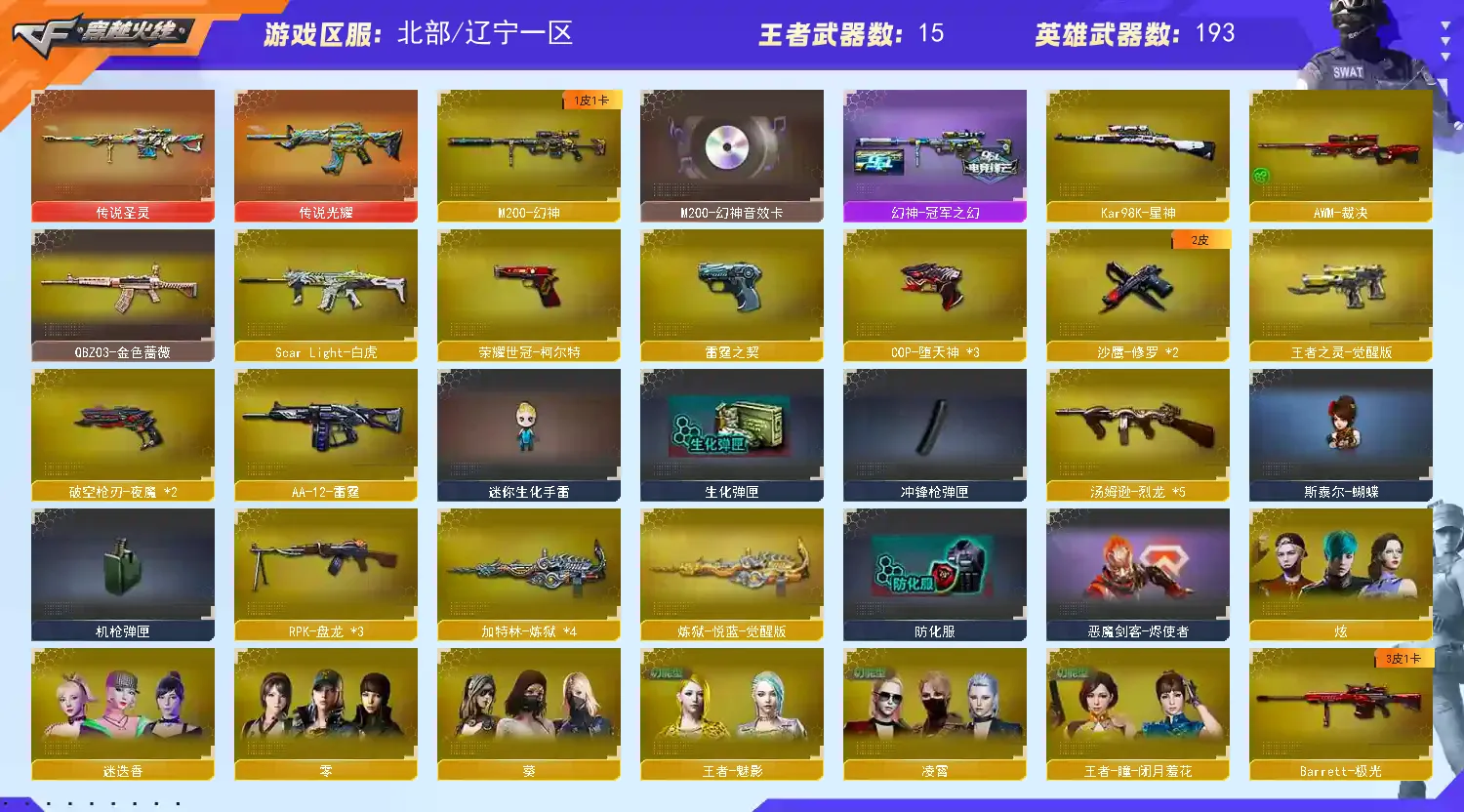 【其他重要武器】炫金骑士/炫金黑龙/炫金无影/炫金雷神/炫金天龙/炫金毁灭/M4A1-十二生肖·龙-雷神/M4A1-英雄-能量核心/黑骑士-摸金校尉/9A-91翡翠/AK47-烛龙/AK47-破空冰刃(2)/9A91-蓝色骑士(2)/9A91-平安夜/M4A1-秘银赤龙(2)/M4A1-SS-枪王排位/AK47-万圣节2018/HK417-赤龙/AK47-QT/M4A1C-死亡之翼/AK47-轮回/QBZ03-吕布/M4A1-万圣节2020/M4A1-樱/M4A1-紫狱(2)/M4A1-战龙/9A91-赤血龙魂(2)/AK47-十二生肖-蛇/黄金AK-47/AK47-齐天大圣/AK47-枪娘/M4A1-S-能量核心/金色小号/雷神-赛博朋克/AK47-娜塔莎/AK-103-红色悦动/HK417-红龙/AK-12-CFS2017纪念版/M200-赤血龙魂(3)/M200-万圣节/M200-涂鸦/AWM-十周年/破天狂龙/雷蛇AWM/暗金M200(2)/M200-大黄蜂/Barrett-怒火大圣/AWM-A(2)/M82A1-红龙/AWM-T(2)/暗金AWM/AWM-小故障/AWM-A-圣诞2021/Barrett-战龙/M200-牡丹/AWM-万圣节刀锋/AWM-万圣节2019/凤凰之怒/AWM-Pink/98K-蓝色骑士/AWM-枪娘(2)/AWM-S/AWM-恶棍-枪王排位/FN弩炮-CFS2017纪念版/MG4-蓝色骑士/KAC-赤烛/KAC-小动物/KAC-耀龙/KAC-情人节2021/火狱乱世-超越Max/P90-炫彩/Steyr TMP-CFS2020纪念版/EVO III-赤血龙魂/斯泰尔-CFS2017纪念版/SPAS-12-雷电核心/修罗-年鹏/凤凰之火(3)/沙鹰-雷蛇/新USP-怒火大圣(2)/COP 357-平天大圣/COP-金蝉子-枪王排位/修罗-摸金校尉/迷彩沙鹰-70KG/Anaconda-黑金神龙(2)/愤怒公牛左轮-枪王排位(2)/新USP-枪王排位奖励(4)/沙鹰-枪王排位/COP 357-青龙/COP 357--绚樱/幻影沙鹰-枪王排位/COP 357-子鼠/无畏之矛/军用铁锹-赤龙/斩魔刀-怒火大圣/虹光丛林匕首-枪王排位/猫猫手套/蝴蝶刀-枪王排位/丛林匕首-卧龙(4)/斩神刀-御龙/幻影扳手-枪王排位/手雷-能量核心(2)/闪光弹-枪王排位(5)/胜利奖杯烟雾弹-枪王排位/红色诅咒娃娃手雷(2)