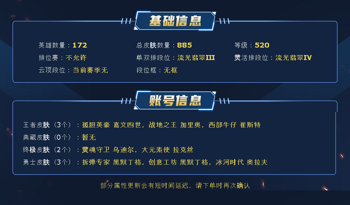 此号已在公安机关信息登记虚拟财产备案,租用期间禁止使用美化包第三方软件外挂等,如导致封号或冻结必将追究到底向平台找到下单IP、手机号实名、下单充值的实名找到本人法院传票到封号者家!把封号者起诉到法院追回账号损失切勿以身试法弄的大家都不好看!感谢支持与配合!根据《刑法》第二百七十五条故意毁坏财物罪:故意毁坏公私财物数额较大或者有其他严重情节的处三年以下有期徒刑、拘役或者罚金数额巨大或者有其他特别严重情节的处三年以上七年以下有期徒刑!切勿以身试法!