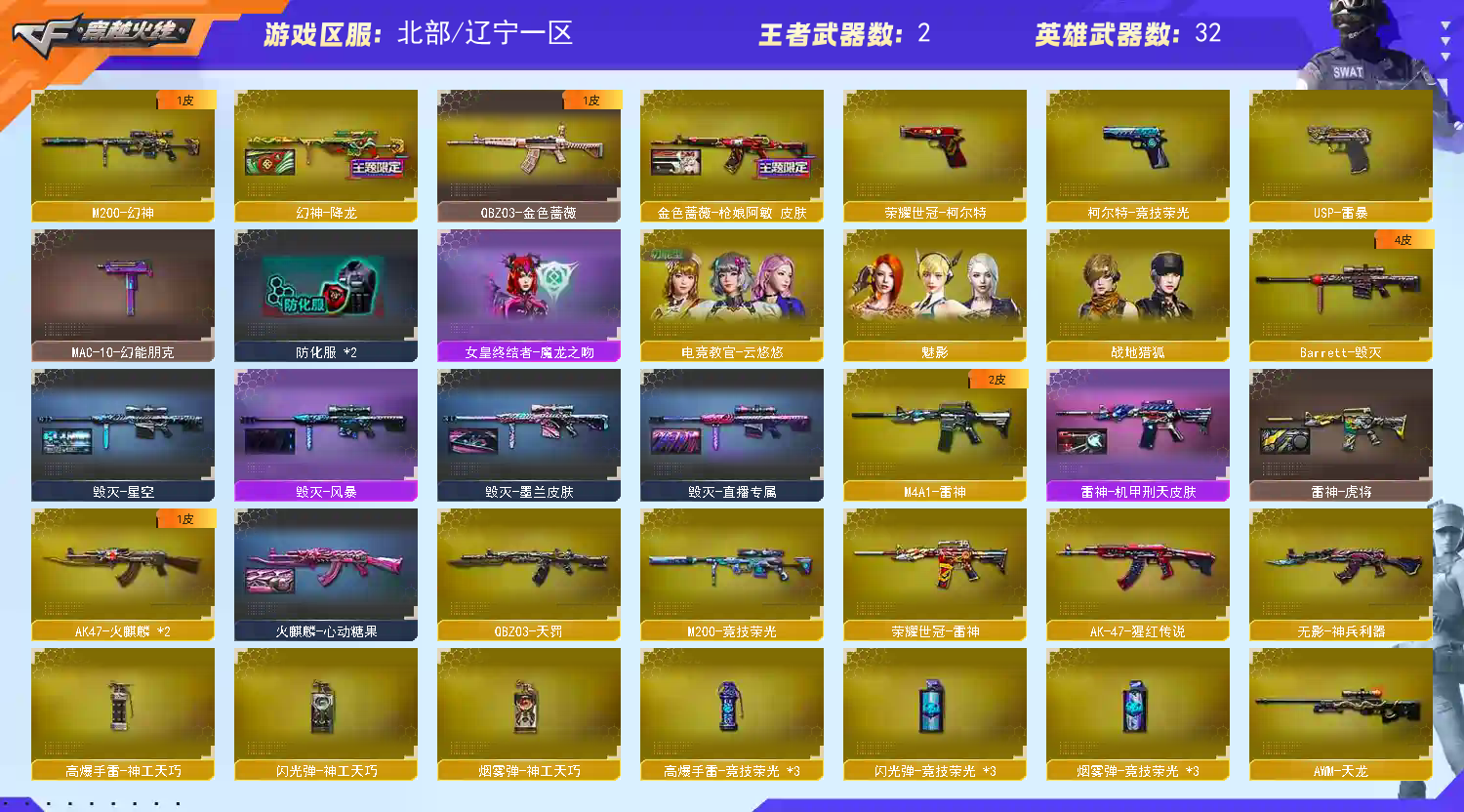 M200幻神降龙❤️悠悠❤️竞技荣光套❤️荣耀世冠套❤️金色蔷薇枪娘阿敏❤️白虎AG冠军皮肤❤️USP雷暴❤️雷神白鲨