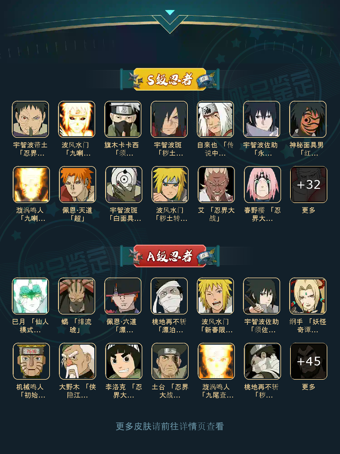 45S 57A 294忍者 妖怪纲手/桃地再不斩「漂泊武士」/蝎 「绯流琥」/佩恩·六道 「漂泊浪客」/波风水门「新春限定」/神秘面具男 「红夜之刃」/宇智波斑 「秽土转生·解」/自来也 「传说中的三忍」/波风水门「秽土转生」/漩涡鸣人 「九喇嘛连结」/宇智波斑「白面具」/宇智波带土「忍界大战」/宇智波佐助 「永恒万花筒」/佩恩·天道「超」/旗木卡卡西 「须佐能乎」