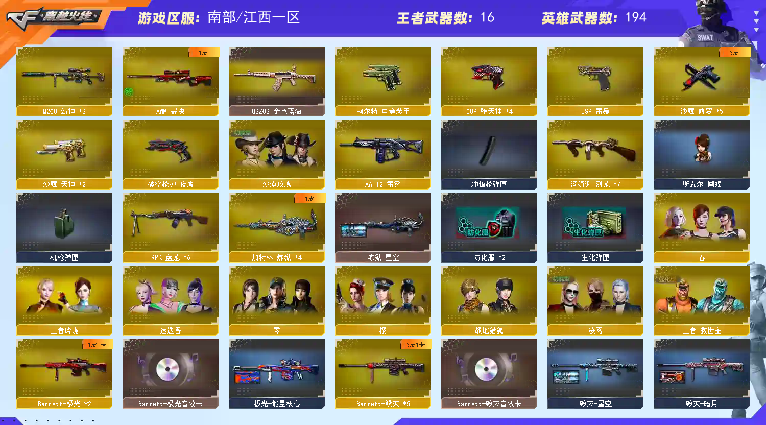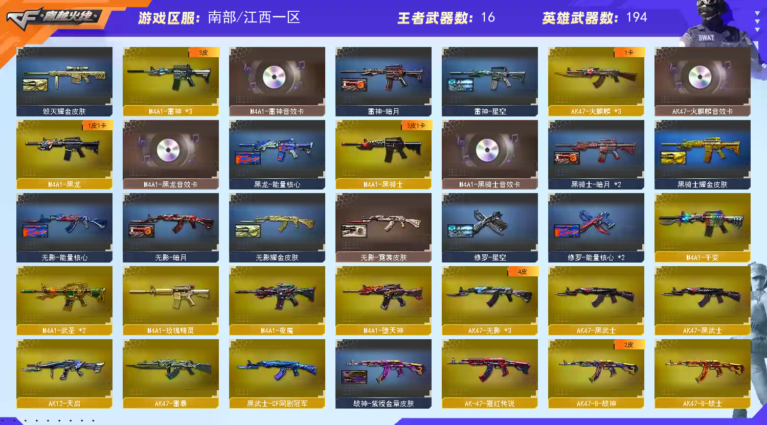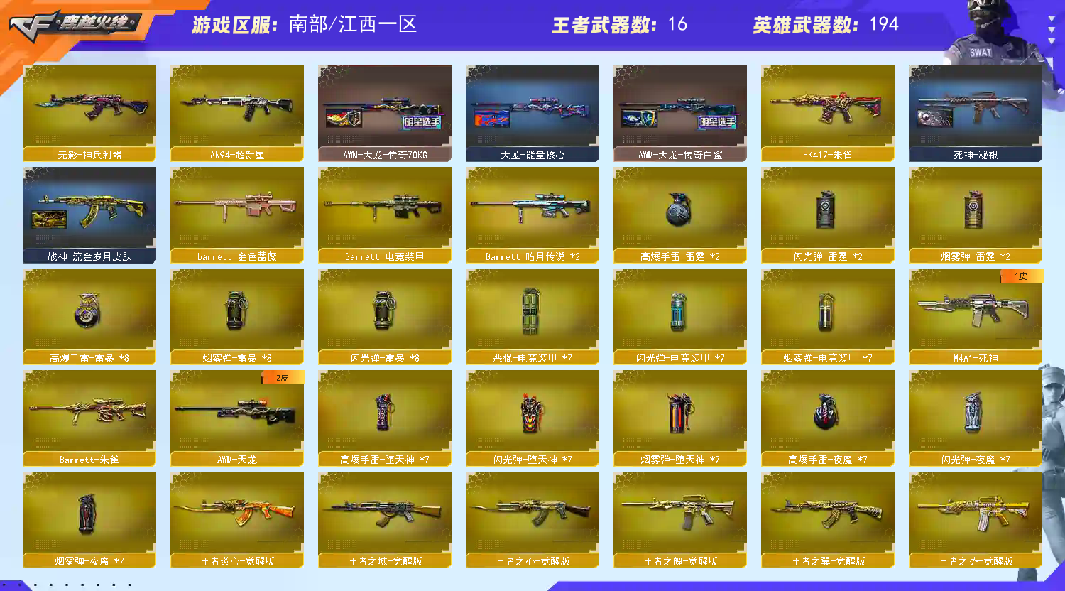 【其他重要武器】炫金雷神/炫金超新星/炫金无影/炫金武士/炫金毁灭/炫金天神/M4A1-英雄-能量核心/火麒麟-暗月/AK47-B-十周年(3)/AK47-破空冰刃(3)/AK47-齐天大圣/HK417-赤血龙魂/M4A1-十年火线/AK47-十年火线/M4A1-肯德基(2)/M4A1-破空冰刃/AK47-青龙(2)/AK12-枪王排位(2)/AK47-轮回/AK47-SS-枪王排位(2)/AK47-死亡之翼/AK47-樱花/M4A1-樱落/56式步枪-梨花(2)/9A91-2017万圣节/AK47-肯德基/9A91-蓝色骑士(4)/M4A1-XS-翔龙(2)/M4A1-樱/M4A1-秘银赤龙(6)/AK-12-CFS2017纪念版(3)/海浪AK47-浏览器(2)/AK47-SS-9周年/M4A1-樱花/AK12-幽灵/雷神-赛博朋克/AK-47-二次元/M14EBR-情人节2020(4)/黄金AK-47(2)/M4A1-紫狱/Scar-Light-赤血龙魂/HK417-赤龙/AK47-枪娘(2)/AK47枪王排位II/9A91-赤血龙魂(5)/HK417-红龙/AK-103-红色悦动/M4A1-SS-枪王排位/M4A1-狂欢-CFS/AK47-狂欢-CFS/神罚/M200-圣诞(2)/AWM-A(2)/凤凰之力(2)/AWM-涂鸦/AWM-Pink/AWM-2018圣诞/AWM-圣诞/M200-万圣节/暗金M200/蓝色魅影(2)/FN弩炮-CFS2017纪念版/AWM-蓝水晶/AWM-恶棍-枪王排位(3)/AWM-卡通(2)/M200-赤血龙魂(4)/AWM-十周年/98K-烛龙/AWM-A枪王排位II/M200-大黄蜂/巴雷特-情人节2020/雷蛇AWM/M200-情人节2019/M200 CheyTac-大圣/98K-蓝色骑士/M200-牡丹/MG4-蓝色骑士/KAC-小动物/斯泰尔-巧克力/斯泰尔-CFS2017纪念版(2)/雷蛇冲锋枪/EVOⅢ-黑金传说/EVO III-赤血龙魂/征服者-毁灭之王 [Lv Max]/阐释者III/沙鹰-枪王排位(3)/沙鹰-雷蛇/Cop357-赤龙(3)/愤怒公牛左轮-枪王排位(2)/凤凰之灵(2)/COP 357--绚樱(2)/新USP-怒火大圣/幻影沙鹰-枪王排位/COP-金蝉子-枪王排位/新USP-枪王排位奖励(3)/Anaconda-雷电核心(2)/Anaconda-炽焰核心/鹰爪-枪王排位/收割者-枪王排位/蝴蝶刀-枪王排位/军用铁锹-飞龙在天(2)/丛林匕首-卧龙(4)/丛林匕首-枪王排位(2)/闪光弹-枪王排位(4)/手雷-能量核心/胜利奖杯烟雾弹-枪王排位(2)/胜利奖杯闪光弹-枪王排位(3)