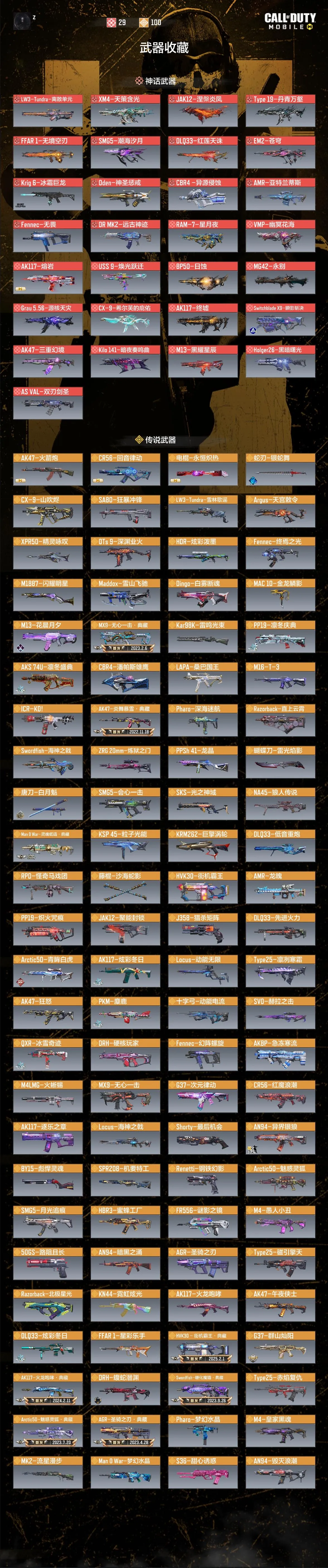EM2-苍穹 Krig6-冰霜巨龙 SwitchbladeX9-瞬影斩决 Oden-神圣惩戒 AK47-三重幻境 Kilo141-暗夜奏鸣曲 CBR4-异源侵蚀 M13-黑耀星辰 AMR-亚特兰蒂斯 Fennec-无畏 Holger26-黑暗曙光 AS VAL-双刃剑圣 DR MK2-远古神迹