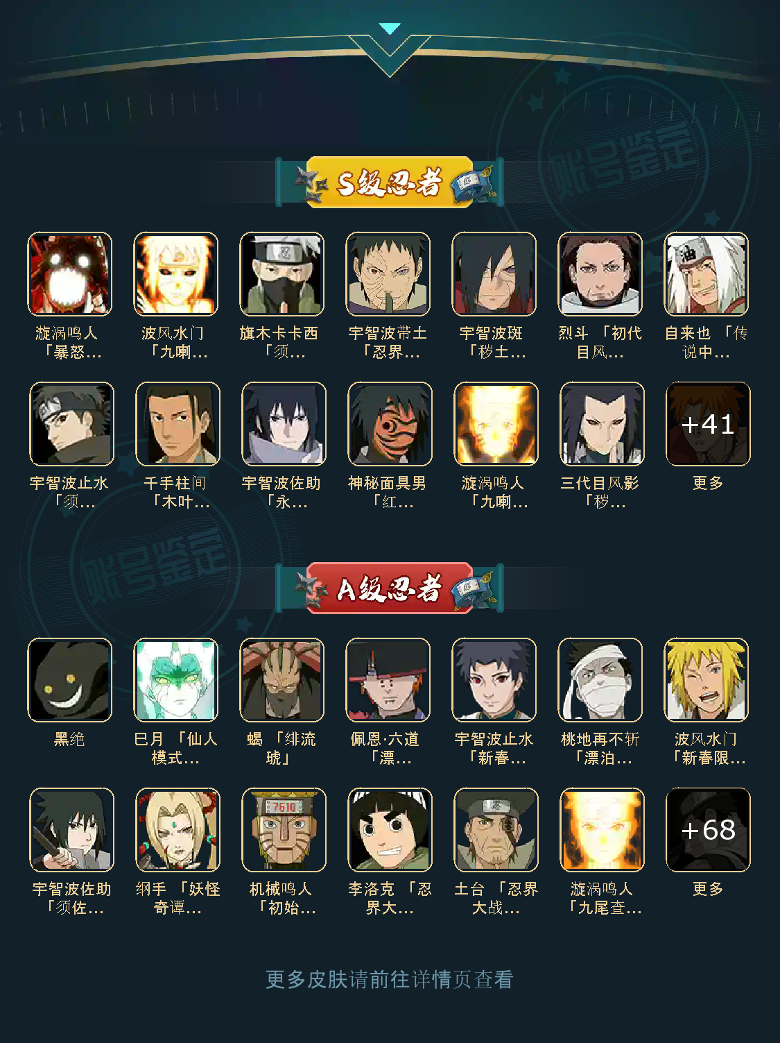 41S❤️秽土解斑/永恒佐助/创立柱间/九喇嘛鸣人/天道超/红面具/金式/幻卡卡西/点券A多/三百忍
