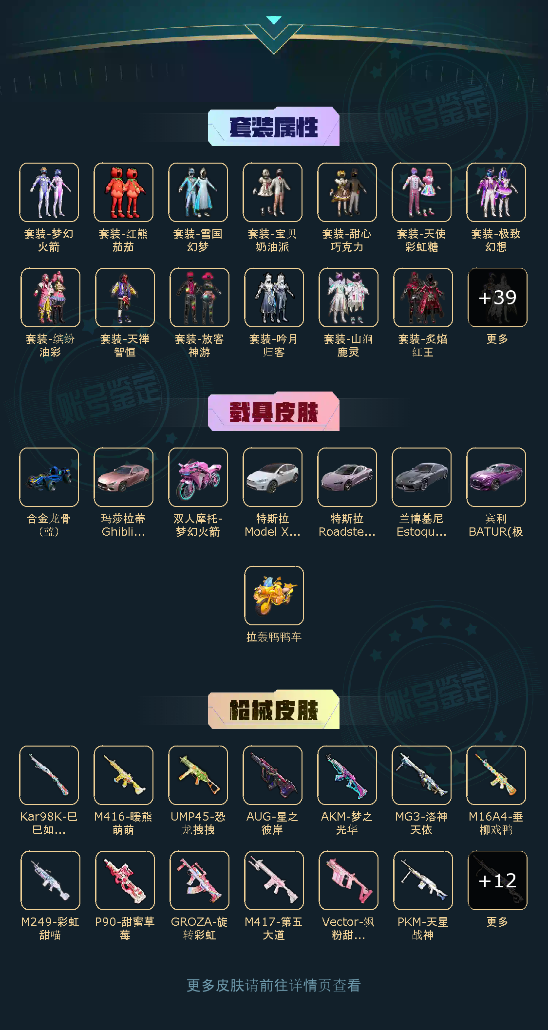 50粉,8载具,23特效枪 286套装 SCAR-L-童趣迷兔/AUG-星之彼岸/M762-激战未来/M416-心之恋语/M416-五爪金龙/MG3-洛神天依/UMP45-相思残雪/UMP45-恐龙拽拽/AKM-梦之光华/特斯拉Model X(珍珠白)/特斯拉Roadster(沁心粉)/双人摩托-梦幻火箭/兰博基尼Estoque(银翼灰)/合金龙骨(蓝)/玛莎拉蒂Ghibli(粉)