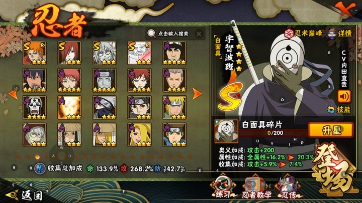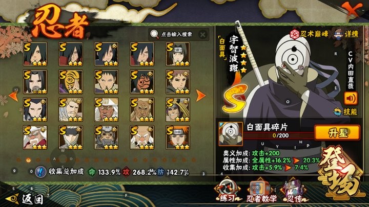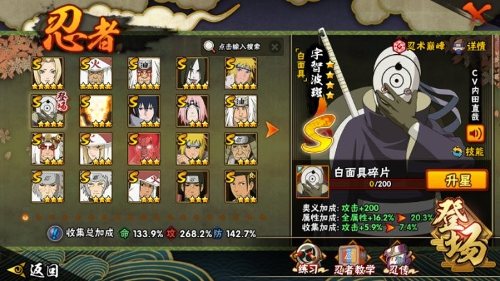 战力:2278W+;VIP14级;S忍45个;A忍49个,通灵兽28个,S忍:5星纲手(普通),5星猿飞日斩(普通),4星仙人模式自来也,4星大蛇丸,4星波风水门(普通),4星白面具宇智波斑,九喇嘛连结漩涡鸣人,永恒万花筒宇智波佐助,忍界大战春野樱,自来也(普通),舞之豪杰自来也,百豪纲手,死门迈特凯,秽土转生波风水门,秽土转生猿飞日斩,秽土转生千手扉间,千手扉间(普通),千手柱间(普通),秽土转生千手柱间,木叶创立千手柱间,宇智波斑(普通),秽土转生宇智波斑,木叶创立宇智波斑,秽土转生解宇智波斑,须佐能乎宇智波鼬,秽土转生宇智波鼬,神秘面具男(普通),忍界大战宇智波带土,红夜之刃神秘面具男,四代目风影罗砂,秽土转生三代目风影,二代目水影鬼灯幻月,四代目雷影艾,三代目雷影艾,秽土转生金角银角,三代目土影大野木,忍界大战大野木,二代目土影无,秽土转生半藏,天道佩恩,超佩恩天道,秽土转生长门,仙人模式药师兜,博人传大筒木金式, ;A忍:5星猿飞阿斯玛(普通),5星干柿鬼鲛(普通),5星迈特凯(普通),5星蝎(普通),4星疾风传我爱罗,4星飞段(普通),4星死司凭血飞段,3星木叶上忍猿飞木叶丸,3星旗木卡卡西(普通),3星宇智波止水(普通),3星九尾查克拉漩涡鸣人,3星宇智波鼬(普通),3星迪达拉(普通),3星青年波风水门,3星秽土转生迪达拉,3星半蛇斗篷药师兜,忍者之路神秘面具男,万花筒写轮眼宇智波佐助,须佐能乎宇智波佐助,最终章日向雏田,七夕限定猿飞阿斯玛,夏日泳装照美冥,桃地再不斩,忍界大战日向宁次,秽土转生猿飞阿斯玛,近松十人卫千代,惊门迈特凯,百豪春野樱,万花筒写轮眼旗木卡卡西,新春限定波风水门,忍界大战秋道丁次,忍界大战我爱罗,五代目水影照美冥,幻之真容旗木卡卡西,仙人模式漩涡鸣人,奇拉比(普通),青年艾,青年长门,晓大蛇丸,新春限定宇智波鼬,忍界大战奇拉比,角都(普通),地怨虞角都,漂泊浪客小南,漂泊武士千手扉间,五代目雷影达鲁伊