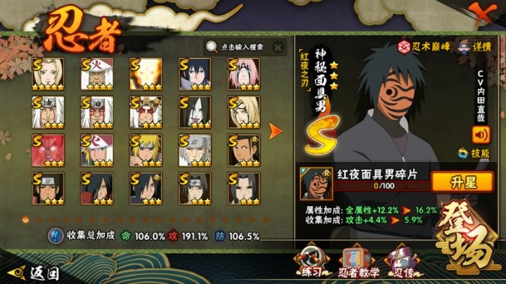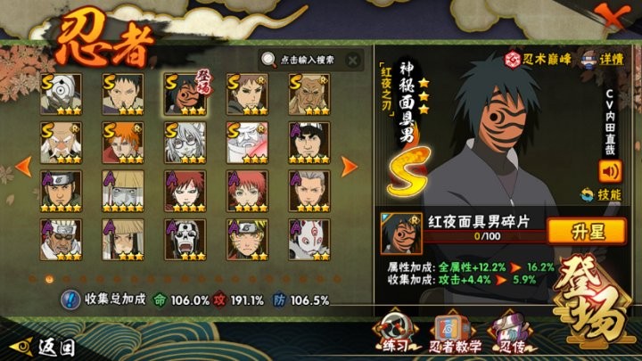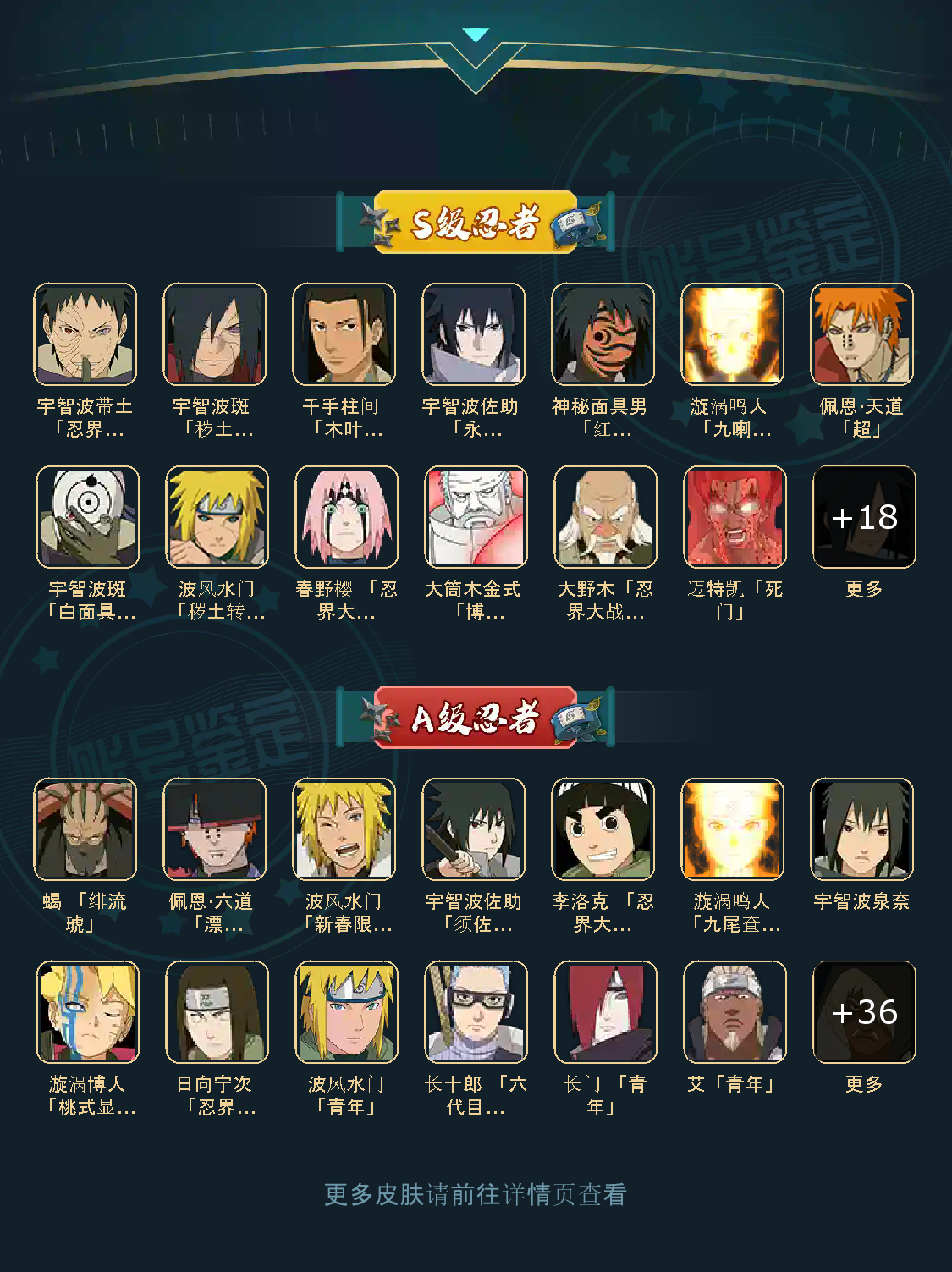 战力:1704W+;S忍30个;A忍43个,通灵兽21个,S忍:普通纲手猿飞日斩九喇嘛鸣人永恒万花筒佐助忍战樱仙人自来也大蛇丸百豪纲手普通自来也豪杰自来也死门凯波风水门秽土水门秽土扉间木叶创立柱间秽土柱间秽土斑木叶创立斑须佐鼬秽土鼬白面具忍