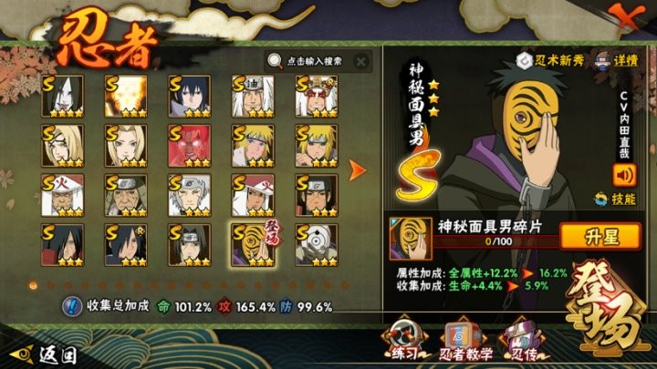 战力:1221W+;VIP12级;S忍25个;A忍41个,通灵兽18个,S忍:大蛇丸九喇嘛鸣人永恒万花筒佐助普通自来也豪杰自来也普通纲手百豪纲手死门凯波风水门秽土水门猿飞日斩秽土猿飞千手扉间千手柱间秽土柱间秽土斑木叶创立斑须佐鼬神秘面具男白...