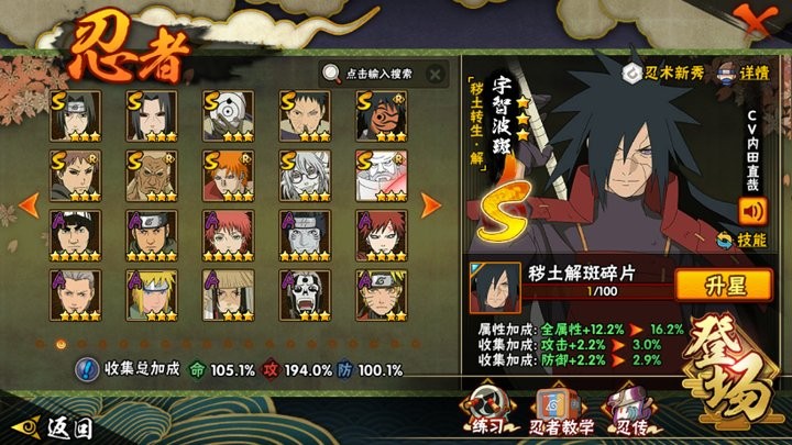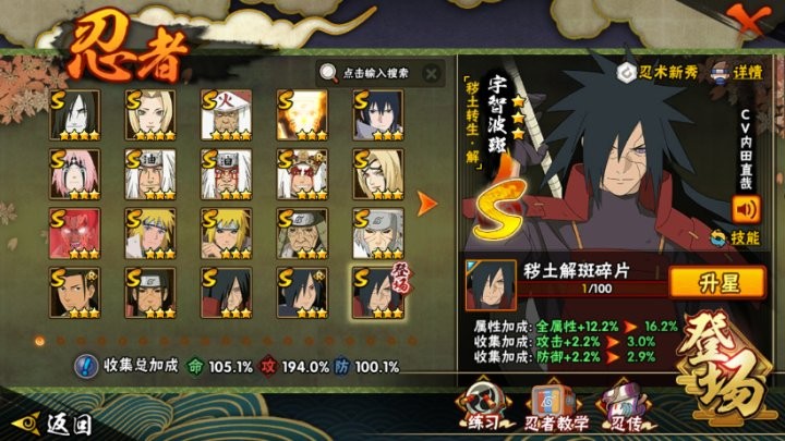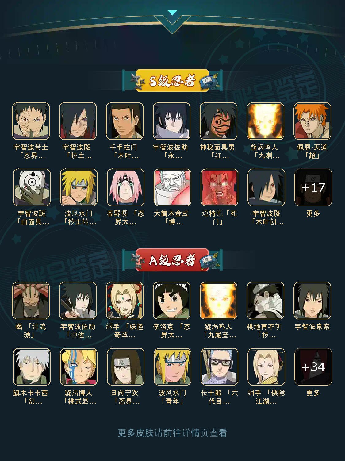 战力:1646W+;S忍30个;A忍40个,通灵兽20个,S忍:大蛇丸普通纲手猿飞日斩九喇嘛鸣人永恒万花筒佐助忍战樱仙人自来也百豪纲手普通自来也豪杰自来也死门凯波风水门秽土水门秽土猿飞秽土扉间木叶创立柱间秽土柱间秽土斑木叶创立斑秽土解斑须佐