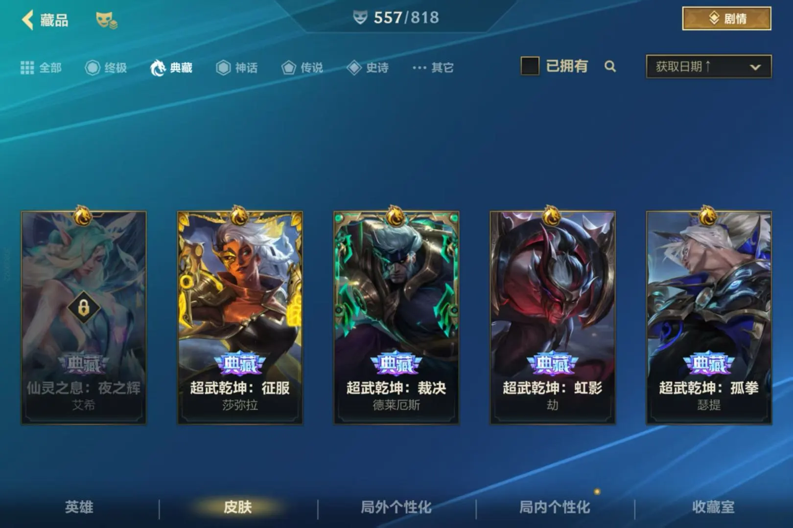 【安卓】 编号q87/4典藏11神话557皮/马年全套秒白龙回城全系列水晶玫瑰全年限神话剑姬传承金克丝灰烬