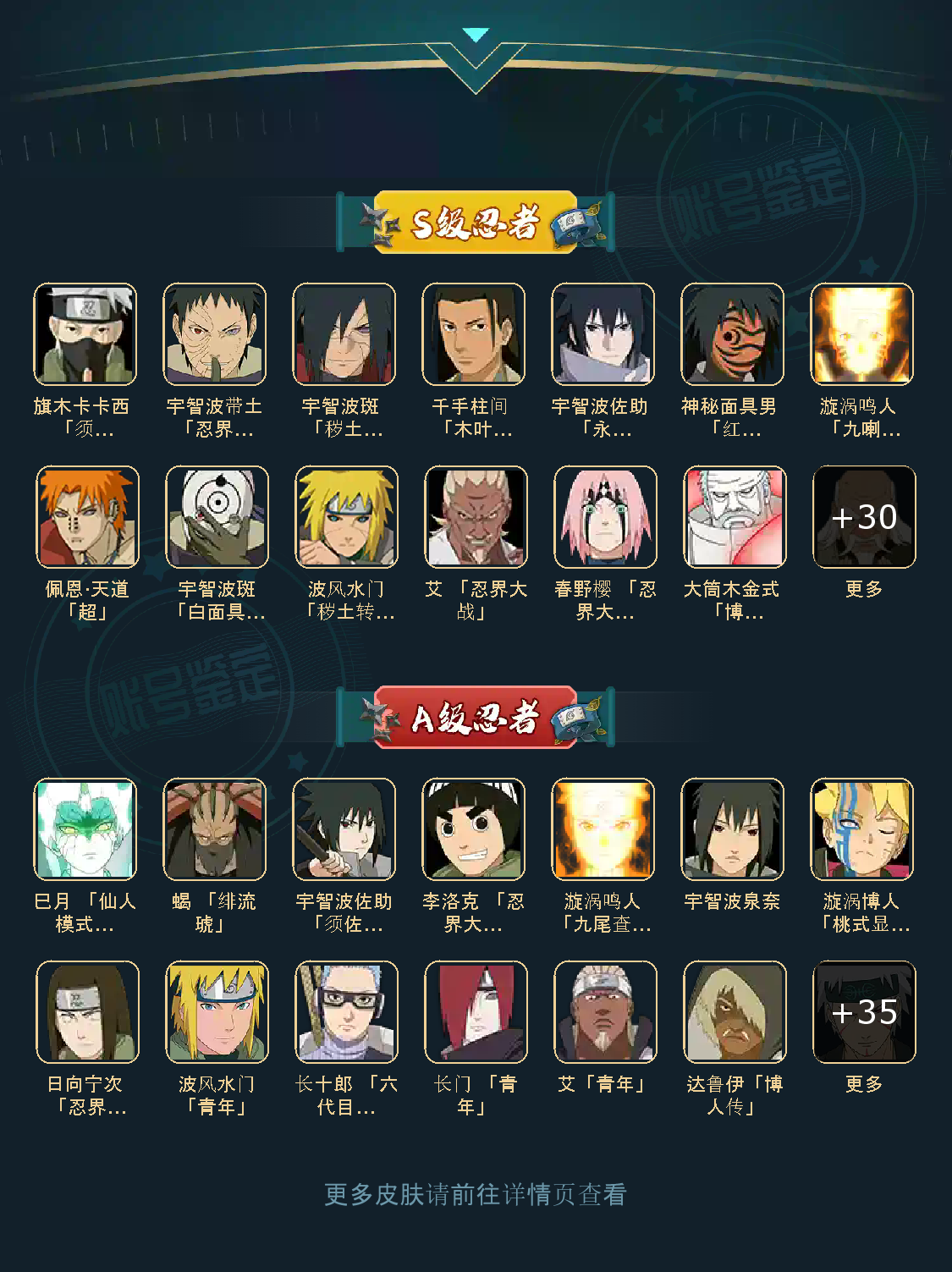 VIP11级;S忍41个;A忍42个,通灵兽20个,S忍:猿飞日斩大蛇丸普通纲手九喇嘛鸣人永恒万花筒佐助忍战樱仙人自来也百豪纲手普通自来也豪杰自来也死门凯波风水门秽土水门秽土猿飞千手扉间秽土扉间千手柱间秽土柱间木叶创立柱...
