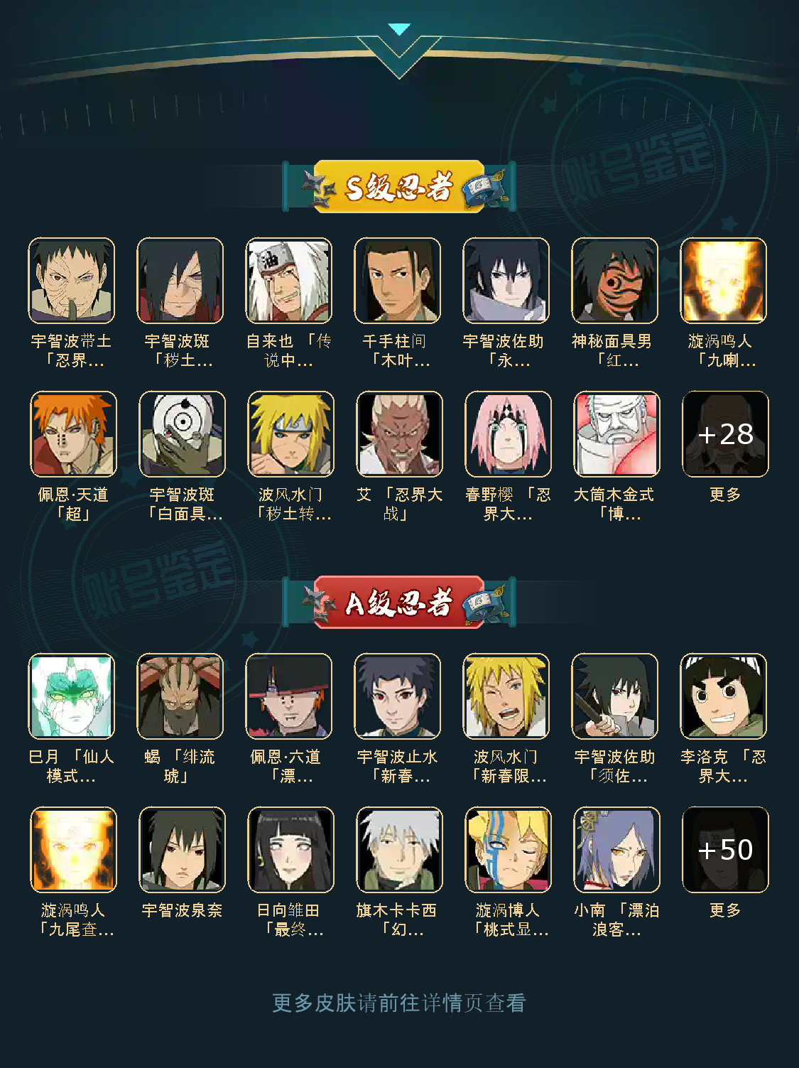 战力:1665W+;VIP13级;S忍40个;A忍56个,通灵兽22个,S忍:大蛇丸普通纲手波风水门猿飞日斩九喇嘛鸣人永恒万花筒佐助忍战樱百豪纲手普通自来也豪杰自来也死门凯秽土水门秽土猿飞千手扉间秽土扉间千手柱间秽土柱间木叶创立柱间宇智波斑