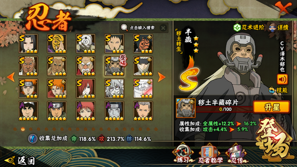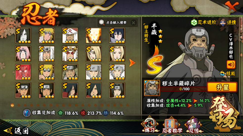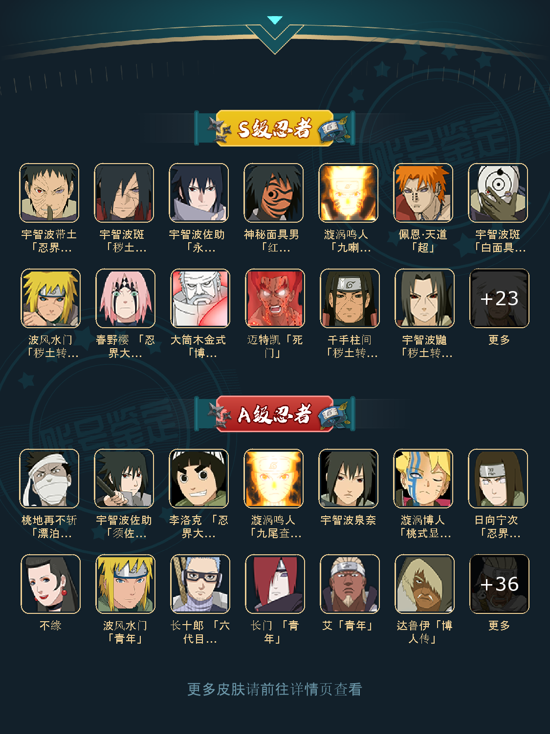 战力:1671W+;S忍35个;A忍44个,通灵兽19个,S忍:大蛇丸波风水门猿飞日斩九喇嘛鸣人永恒万花筒佐助忍战樱百豪纲手普通纲手普通自来也豪杰自来也死门凯秽土水门秽土猿飞千手扉间秽土扉间千手柱间秽土柱间宇智波斑秽土斑须佐鼬秽土鼬神秘面具
