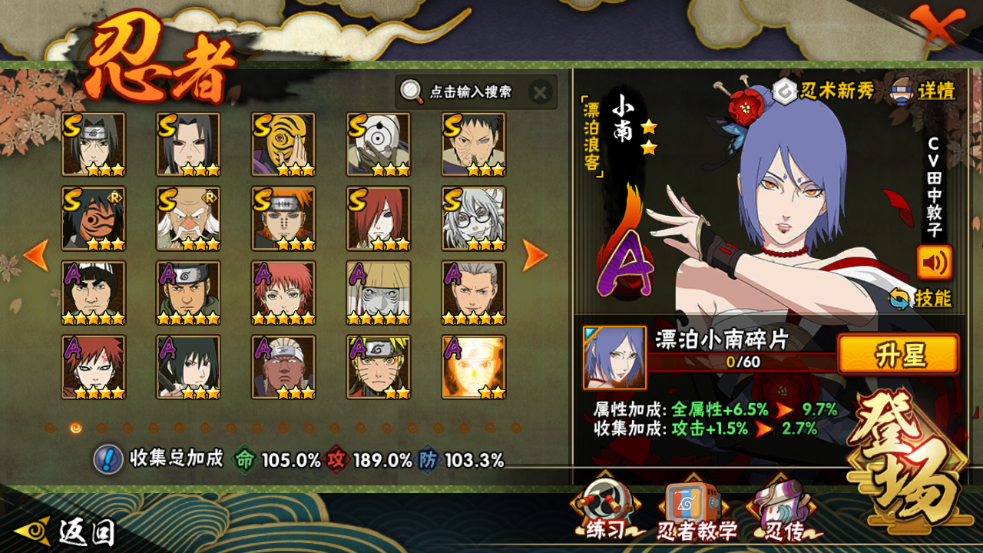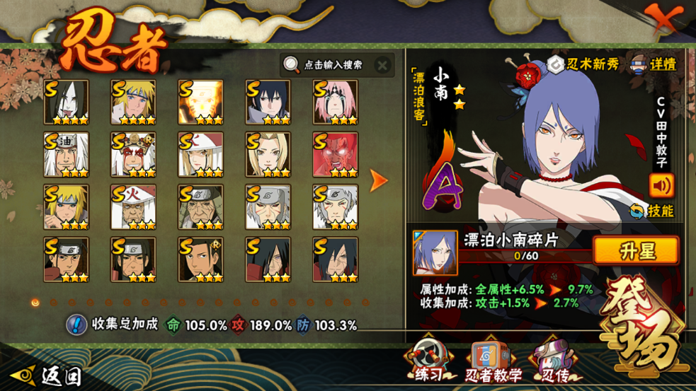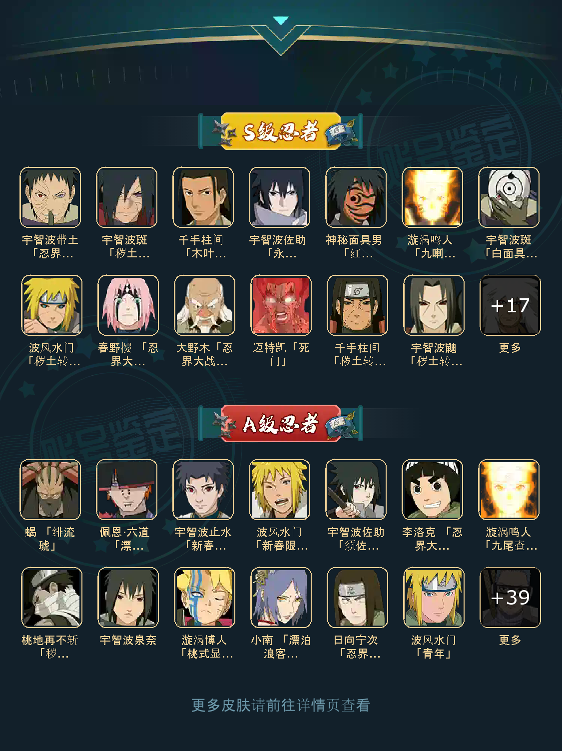 战力:1147W+;VIP12级;S忍30个;A忍46个,通灵兽20个,S忍:大蛇丸波风水门九喇嘛鸣人永恒万花筒佐助忍战樱百豪纲手普通纲手死门凯普通自来也豪杰自来也秽土水门猿飞日斩秽土猿飞秽土扉间千手扉间千手柱间秽土柱间木叶创立柱间秽土斑秽