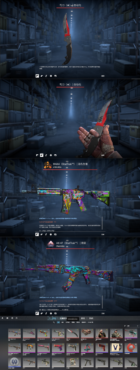 5e高校绿色丶红色套装弯刀自动化丶狂牙手套丶ak47夜愿丶awp迷人眼丶探员音乐盒丶豪华主战皮肤