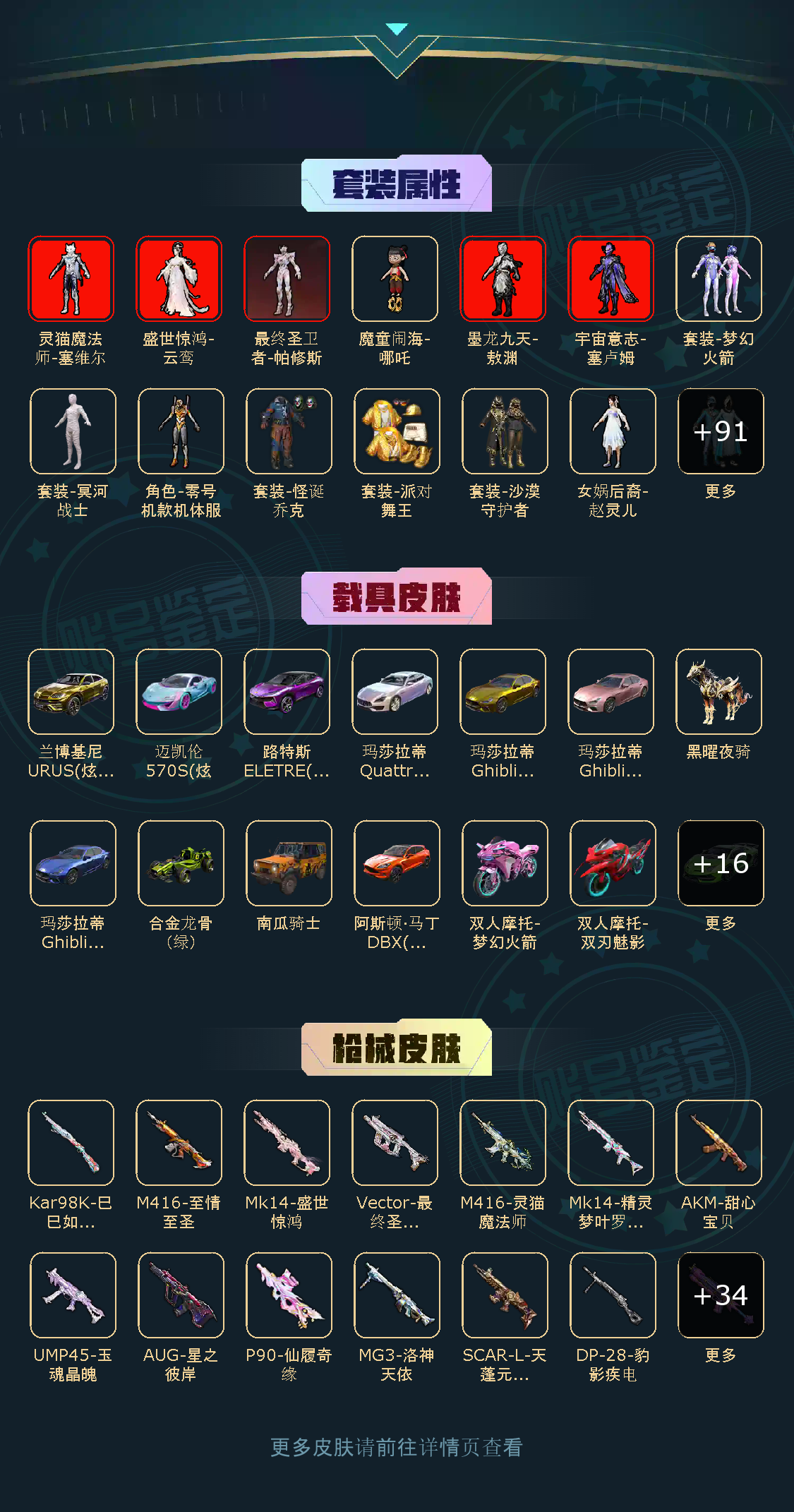 96粉,27载具,399套装,DP-28-暗夜鎏金/AKM-盖世英雄/UZI-畅跳缤纷/AKM-甜心宝贝/DP-28-扶摇飞仙/SCAR-L-梦幻火箭/SCAR-L-童趣迷兔/Kar98K-伏魔团/爆炸猎弓-雪梅暗香/M416-风花雪月/AUG-星之彼岸/P90-仙履奇缘/AWM-花间之火/GROZA-旋转彩虹/Vector-红伞翩翩/P90-甜蜜草莓/SKS-诡面斩/GROZA-香水柠檬/Mk14-精灵梦叶罗丽/SPAS-12-音爆索尼克/AWM-橘柚倾心/SCAR-L-天蓬元帅/UMP45-宇宙意志/M416-心之恋语/平底锅-林间仙鹿/Mini14-荧光虫舞/M416-五爪金龙/M16A4-垂柳戏鸭/MG3-洛神天依/M416-墨龙九天/M762-冷魅冰骑/M416-至情至圣/SLR-暗夜玫瑰/S12K-海渊国主/M762-甜蜜誓约/UMP45-相思残雪/M24-星之信仰/M249-蓝莓炮弹/野牛-流星咚咚/UMP45-玉魂晶魄/兰博基尼Aventador(翡翠绿)/迈凯伦570S(炫冰蓝)/玛莎拉蒂Ghibli(金)/萌喵橘座/阿斯顿·马丁DBX(橙)/兰博基尼URUS(炫光金)/海龙奔腾/特斯拉Roadster(沁心粉)/乔治·巴顿战车(鎏金黑)/玛莎拉蒂Ghibli(蓝)/双人摩托-梦幻火箭/特斯拉Cybertruck(荒芜蓝)/兰博基尼Estoque(炫光金)/快艇-塞莎KL27(深潜蓝)/布尔玛摩托车/双人摩托-双刃魅影(红)/路特斯ELETRE(电光紫)/灵鼠银迹/拉轰鸭鸭车/合金龙骨(绿)/特斯拉Roadster(水滴蓝)/玛莎拉蒂Quattroporte幻星粉/极速兔兔/南瓜骑士/兰博基尼Estoque(尊享铂)/玛莎拉蒂Ghibli(粉)/兰博基尼SVJ(炫光金)/