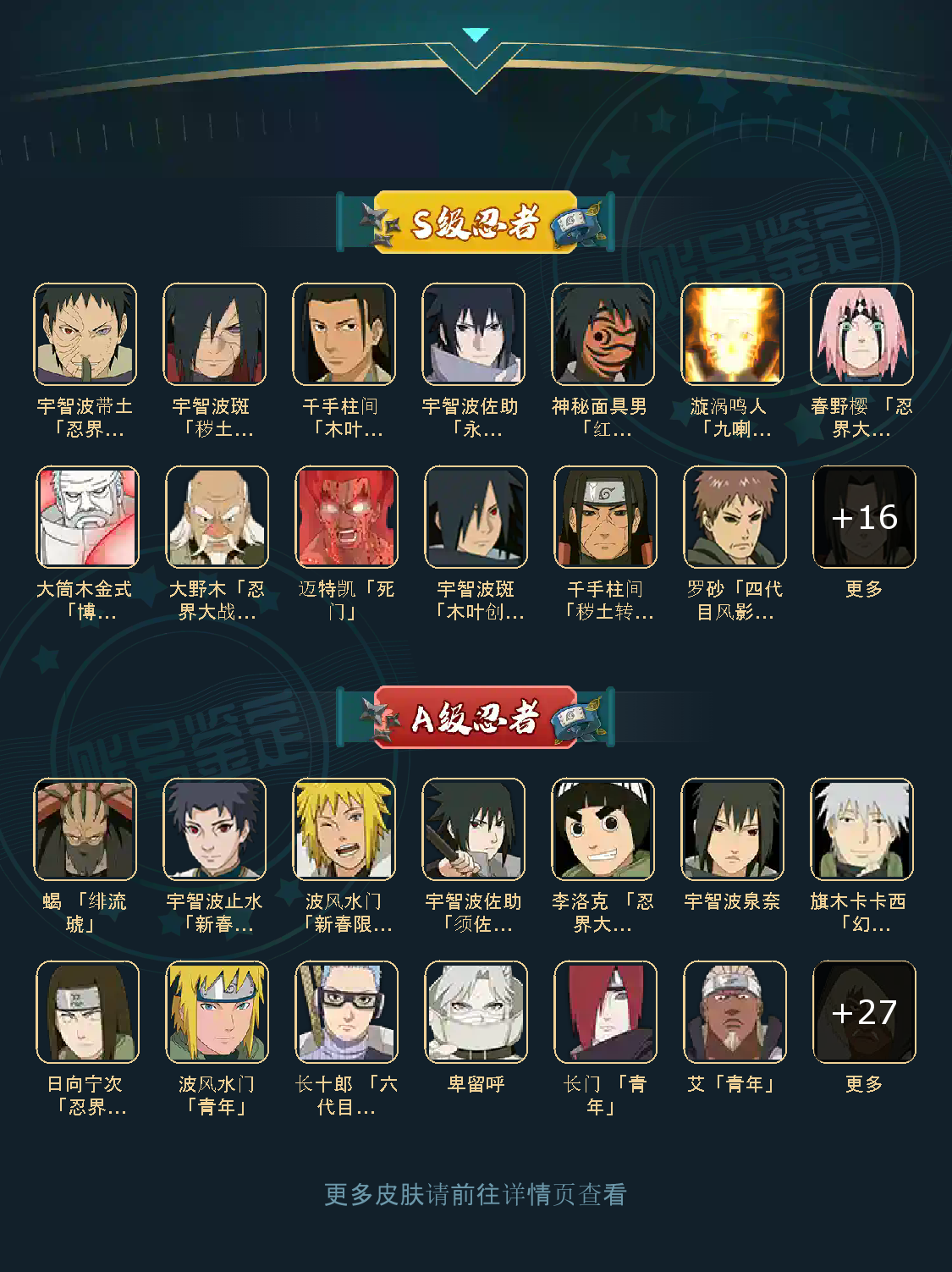 战力:1564W+;S忍28个;A忍34个,通灵兽22个,S忍:普通纲手猿飞日斩大蛇丸九喇嘛鸣人永恒万花筒佐助忍战樱仙人自来也百豪纲手普通自来也豪杰自来也死门凯波风水门千手扉间千手柱间木叶创立柱间秽土柱间木叶创立斑秽土解斑须佐鼬秽土鼬忍战带