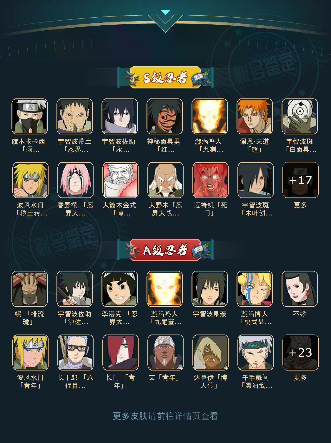 战力:1189W+;S忍30个;A忍29个,通灵兽19个,S忍:普通纲手九喇嘛鸣人永恒万花筒佐助忍战樱仙人自来也大蛇丸死门凯波风水门秽土水门豪杰自来也猿飞日斩秽土猿飞秽土柱间秽土斑木叶创立斑须佐鼬秽土鼬白面具忍战带土红夜面具男罗砂忍战大野木