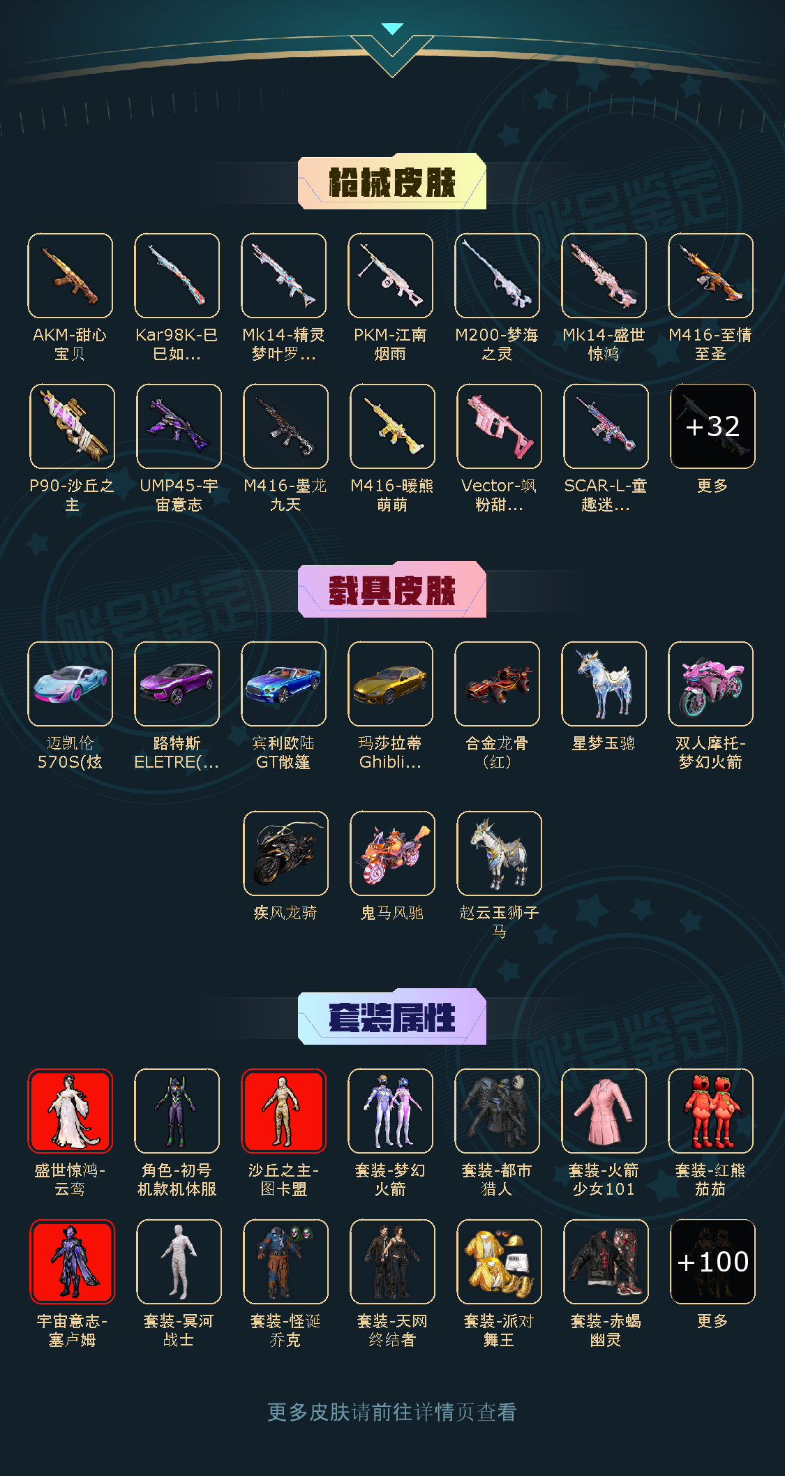 103粉,10载具,378套装,DP-28-暗夜鎏金/M417-第五大道/UZI-绮梦青鸾/AKM-甜心宝贝/Vector-飒粉甜心/SCAR-L-童趣迷兔/AUG-星之彼岸/M249-彩虹甜喵/平底锅-仲夏莫吉托/AWM-花间之火/M762-甜心娃娃/汤姆逊-怪笑疯兔/P90-甜蜜草莓/GROZA-香水柠檬/Mk14-精灵梦叶罗丽/M416-暖熊萌萌/SPAS-12-音爆索尼克/P90-金丰海韵/UMP45-宇宙意志/M416-心之恋语/SCAR-L-纯梦嫁纱/Mk14-闲梦青缨/M16A4-垂柳戏鸭/Kar98K-未来歌姬/MG3-洛神天依/Vector-环太平洋/M416-墨龙九天/M200-梦海之灵/M416-至情至圣/PKM-江南烟雨/AUG-妙趣可丽/UMP45-雪国精灵/烟雾弹-猫咪绅士/野牛-青空秋雨/UMP45-恐龙拽拽/M249-蓝莓炮弹/P90-沙丘之主/蜜獾-辉耀战甲/破片手榴弹-粉粉猫爪/AKM-梦之光华/M24-莲影清波/迈凯伦570S(炫冰蓝)/玛莎拉蒂Ghibli(金)/疾风龙骑/双人摩托-梦幻火箭/星梦玉骢/宾利欧陆GT敞篷(深空蓝)/路特斯ELETRE(电光紫)/赵云玉狮子马/鬼马风驰/合金龙骨(红)/