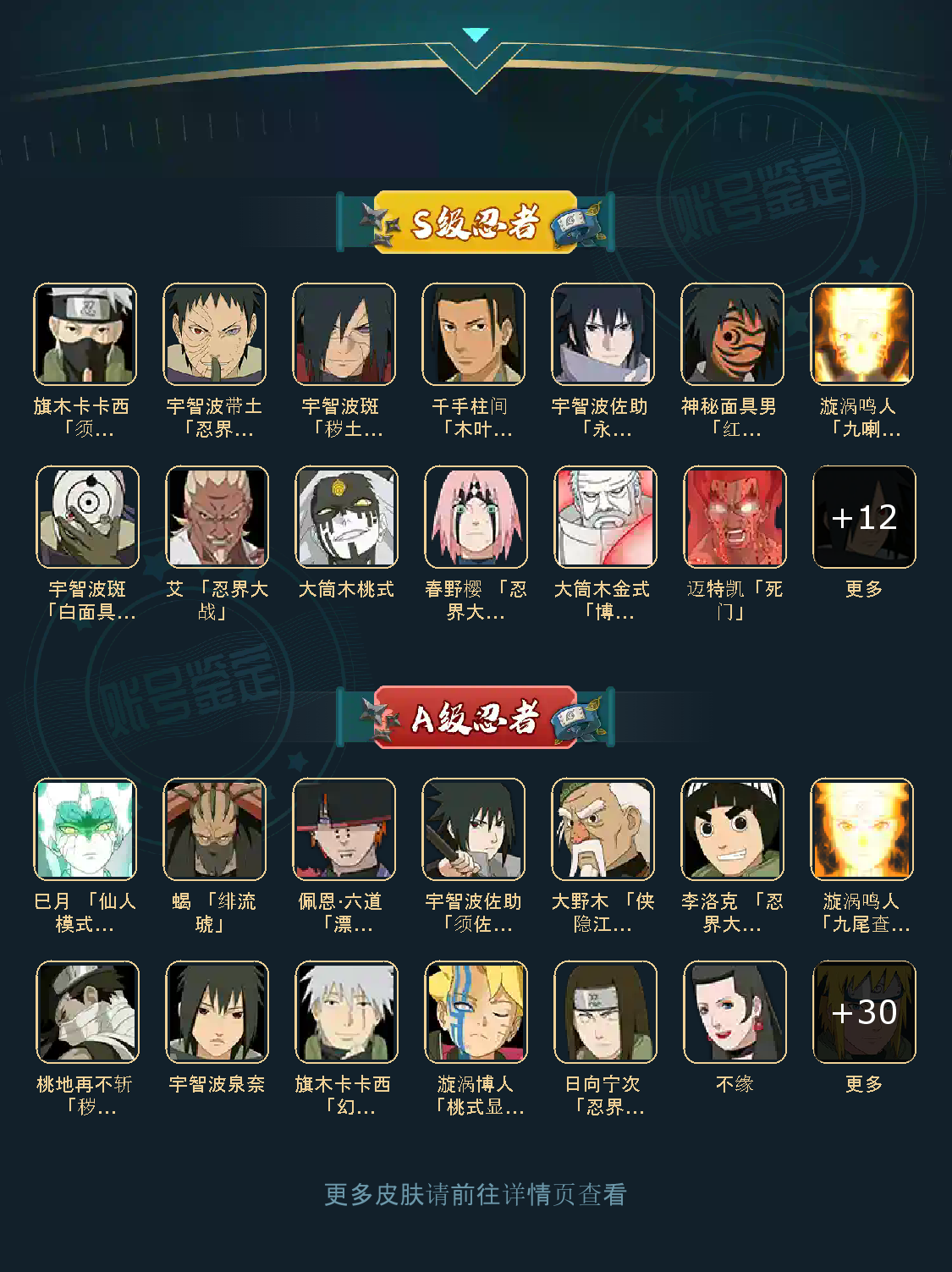 战力:1238W+;VIP11级;S忍22个;A忍33个,通灵兽21个,S忍:普通纲手九喇嘛鸣人永恒万花筒佐助忍战樱豪杰自来也大蛇丸死门凯波风水门秽土猿飞猿飞日斩秽土柱间木叶创立柱间木叶创立斑秽土解斑秽土鼬神秘面具男白面具忍战带土红夜面具男...展开全部