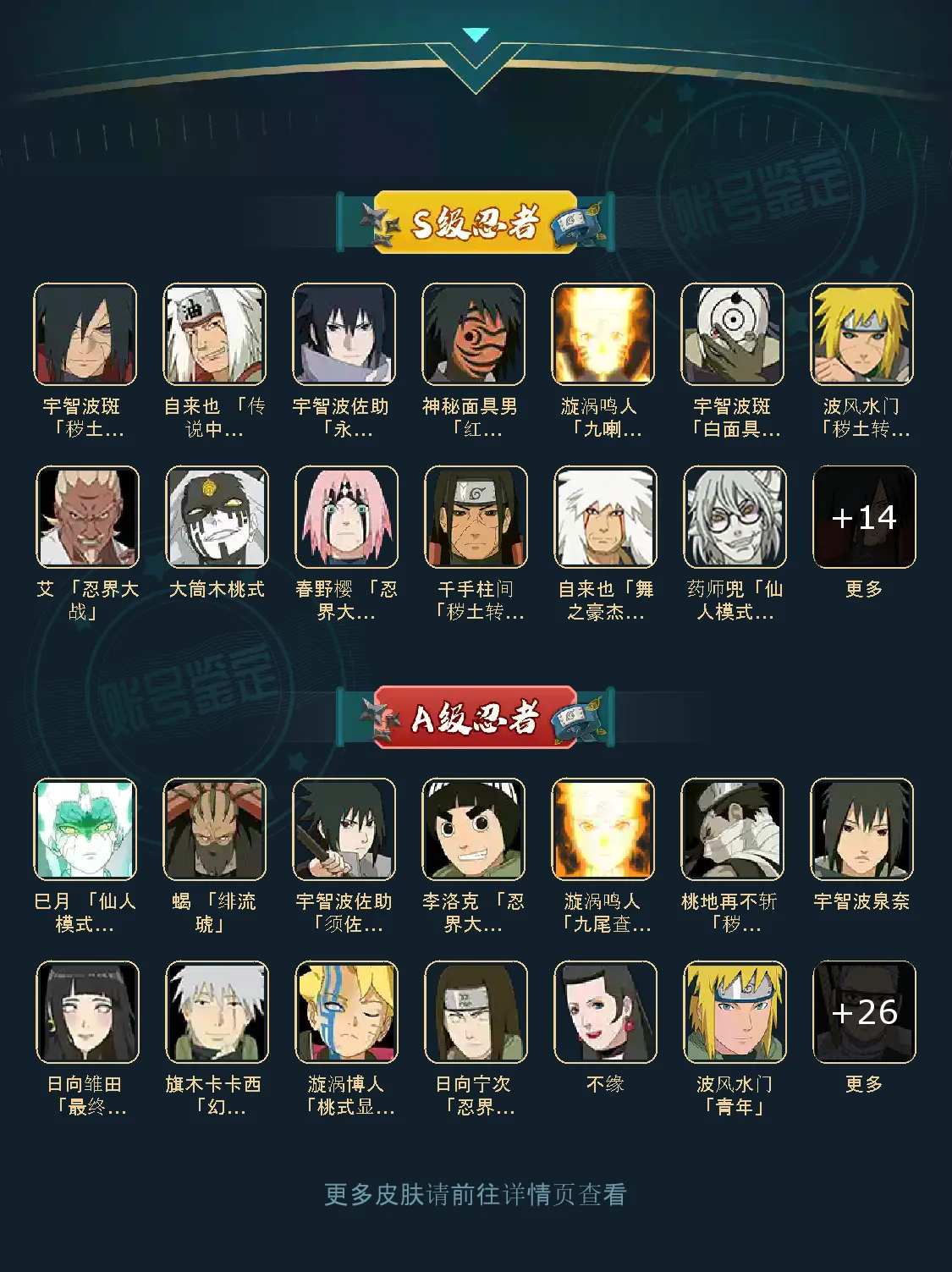 战力:1001W+;VIP10级;S忍22个;A忍30个,通灵兽19个,S忍:九喇嘛鸣人永恒万花筒佐助忍战樱普通自来也豪杰自来也大蛇丸普通纲手波风水门秽土水门猿飞日斩秽土猿飞秽土扉间千手柱间秽土柱间秽土斑秽土解斑白面具红夜面具男三代艾二代土