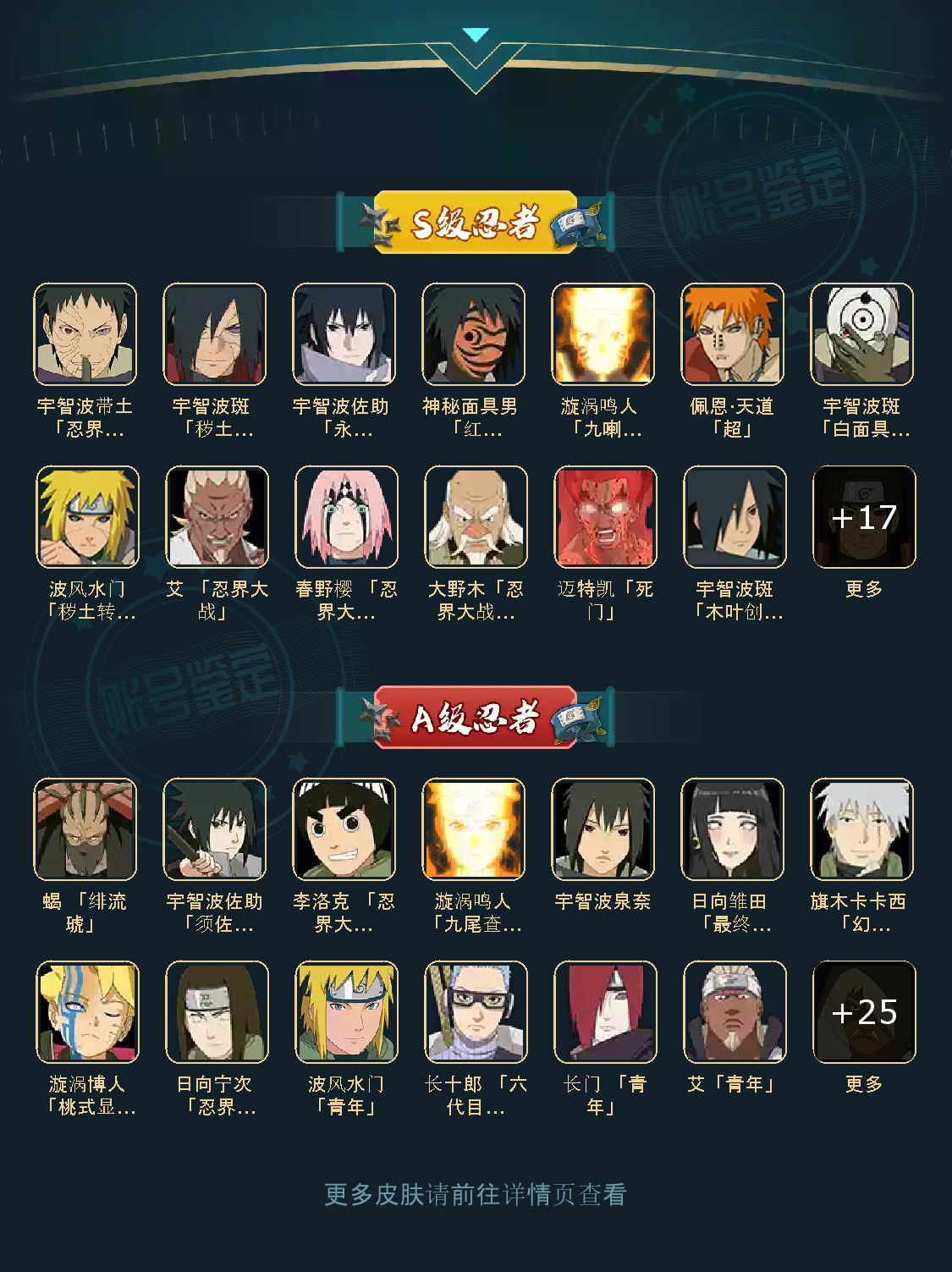 战力:865W+;VIP10级;S忍30个;A忍33个,通灵兽17个,S忍:九喇嘛鸣人永恒万花筒佐助忍战樱普通自来也豪杰自来也大蛇丸死门凯波风水门秽土水门秽土猿飞秽土扉间千手扉间秽土柱间秽土斑木叶创立斑秽土解斑秽土鼬神秘面具男白面具忍战带土
