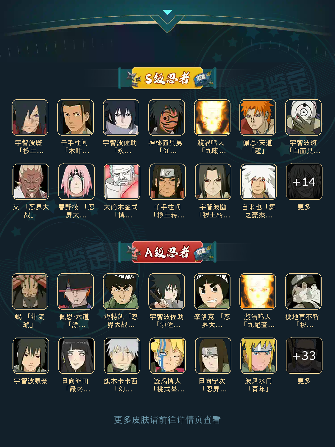 战力:1173W+;VIP13级;S忍22个;A忍37个,通灵兽20个,S忍:普通纲手九喇嘛鸣人永恒万花筒佐助忍战樱豪杰自来也大蛇丸波风水门猿飞日斩秽土扉间木叶创立柱间秽土柱间秽土斑秽土解斑秽土鼬白面具红夜面具男鬼灯幻月三代艾天道超秽土长门