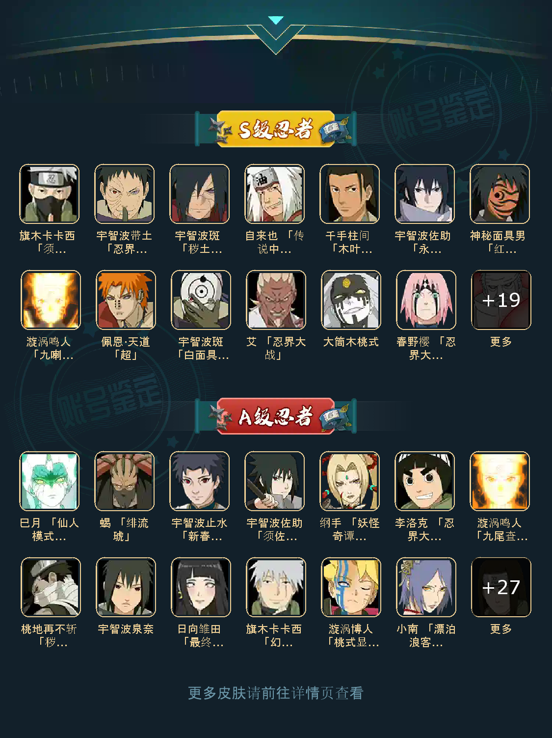 战力:1353W+;VIP11级;S忍30个;A忍30个,通灵兽18个,S忍:普通纲手猿飞日斩九喇嘛鸣人永恒万花筒佐助忍战樱仙人自来也大蛇丸死门凯普通自来也豪杰自来也波风水门秽土猿飞秽土扉间木叶创立柱间秽土柱间木叶创立斑秽土解斑须佐鼬秽土鼬