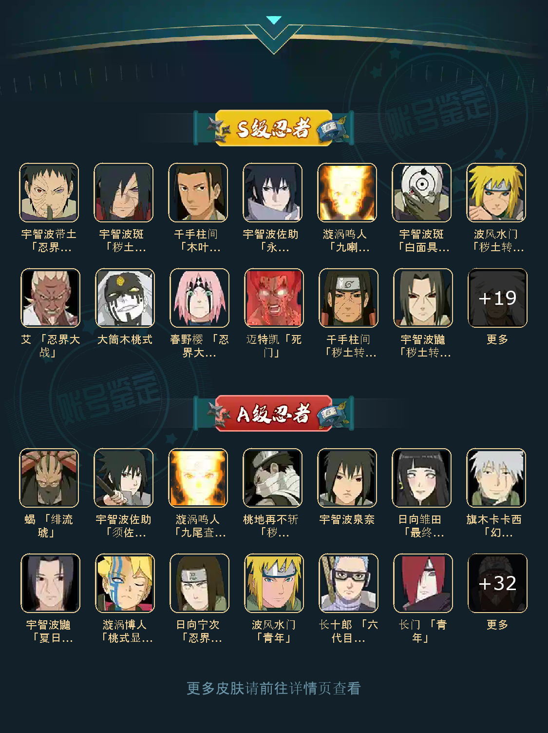 战力:1174W+;VIP11级;S忍28个;A忍38个,通灵兽19个,S忍:大蛇丸九喇嘛鸣人永恒万花筒佐助忍战樱普通自来也百豪纲手死门凯波风水门秽土水门豪杰自来也秽土猿飞秽土扉间千手柱间木叶创立柱间秽土柱间宇智波斑秽土斑秽土解斑秽土鼬白面