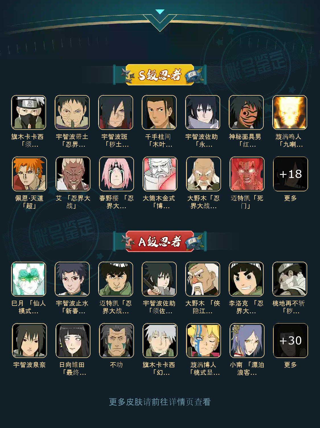 战力:1480W+;VIP11级;S忍26个;A忍33个,通灵兽20个,S忍:普通纲手猿飞日斩大蛇丸九喇嘛鸣人永恒万花筒佐助忍战樱仙人自来也死门凯普通自来也豪杰自来也波风水门秽土猿飞木叶创立柱间秽土柱间木叶创立斑秽土解斑秽土鼬神秘面具男忍战
