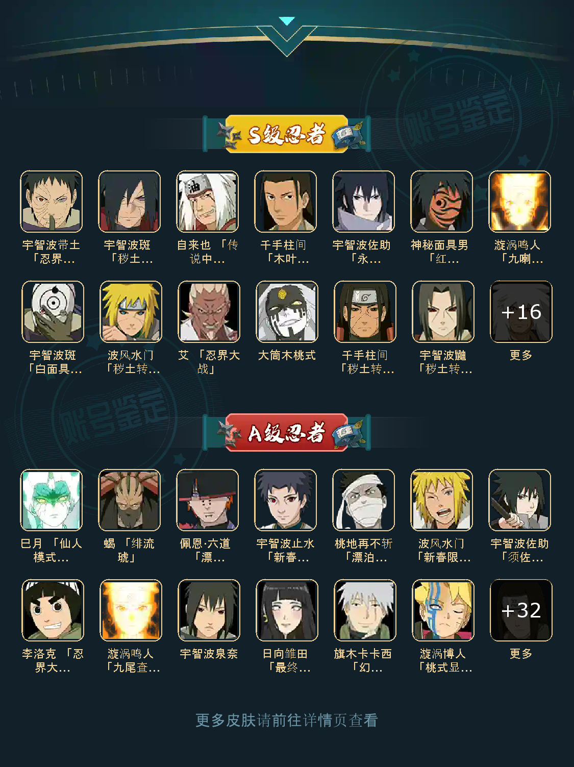 战力:1018W+;VIP11级;S忍26个;A忍36个,通灵兽20个,S忍:九喇嘛鸣人永恒万花筒佐助豪杰自来也大蛇丸普通纲手波风水门秽土水门秽土猿飞秽土扉间秽土柱间木叶创立柱间秽土斑秽土解斑白面具忍战带土红夜面具男鬼灯幻月三代艾秽土半藏二